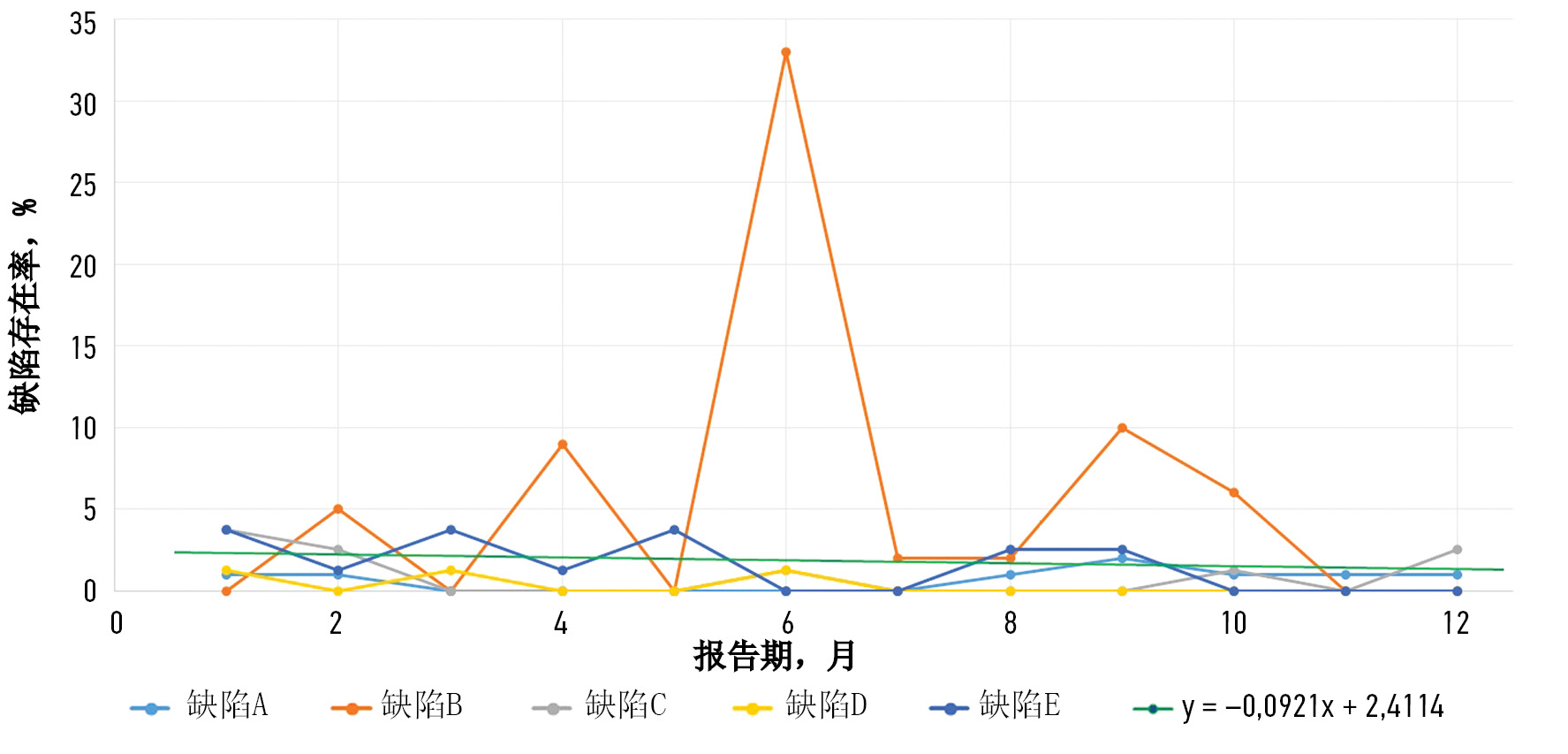 To quantify this trend, the corresponding trend lines were added. These were linear functions k × x + b, where k indicates the slope of the approximation curve, i.e., it indicates a tendency to increase or decrease the number of defects, and b corresponds to the number of defects at the beginning of the monitoring. The approximation was performed for all AI-based software for individual modalities, and the entire data set was approximated at once (Figures 1 and 2). It is possible to predict changes in technological defect removal for each AI-based software product separately or for the entire range if k is known.