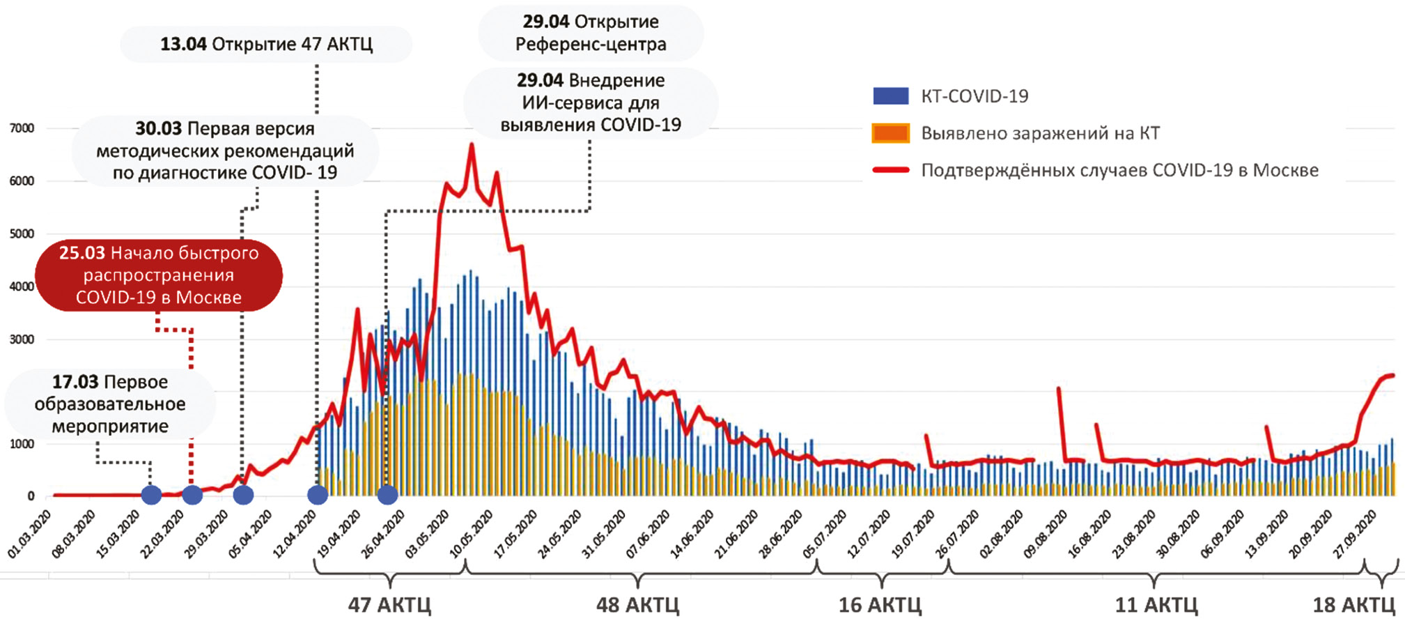 As of October 19, 2020, OCTC specialists have conducted 268,567 CT studies. The record was achieved by one CT scanner that made 204 CT studies in 1 day. Pneumonia signs were detected in 130,138 patients, 126,761 of which were diagnosed with “clinically confirmed COVID-19 case”. As a result, over the specified period, 34.5% of all diagnoses in Moscow were established using medical imaging techniques.
