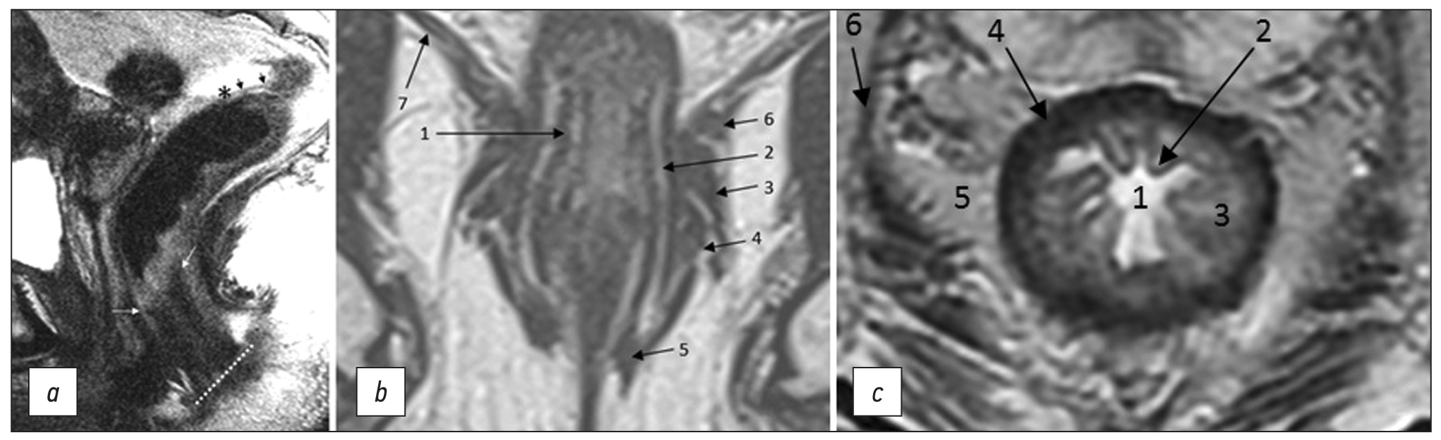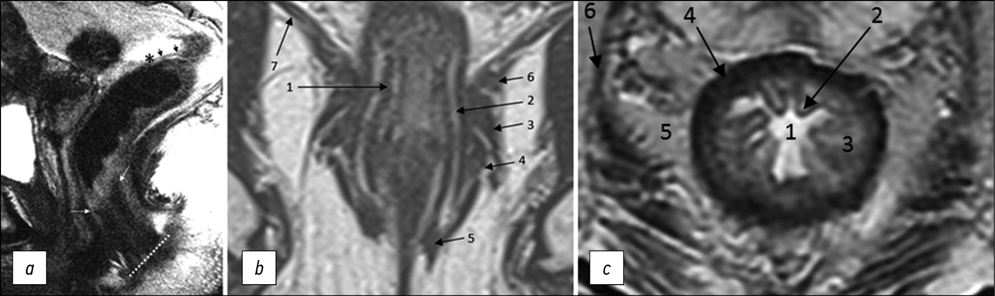 Fig. 1. MRI anatomy of the rectum on T2-WI. (a) Sagittal plane: anal edge (intersphincteric groove; dotted line); anorectal junction (angle) at the level of the upper border of the internal sphincter of the anal canal (white arrows); transitional fold of the peritoneum at the lower point of attachment of the pelvic visceral peritoneum to the rectal wall (asterisk); peritonealized part of the rectum (black arrows). (b) Coronal plane: 1, internal sphincter of the anal canal; 2, intersphincteric space; 3, deep portion of the external sphincter; 4, superficial portion of the external sphincter; 5, subcutaneous portion of the external sphincter; 6, puborectalis muscle; 7, elevator muscle of anus (levator ani). (c) Axial plane: 1, intestinal lumen; 2, mucous membrane; 3, submucosal layer; 4, muscle layer; 5, mesorectal tissue; 6 mesorectal fascia.