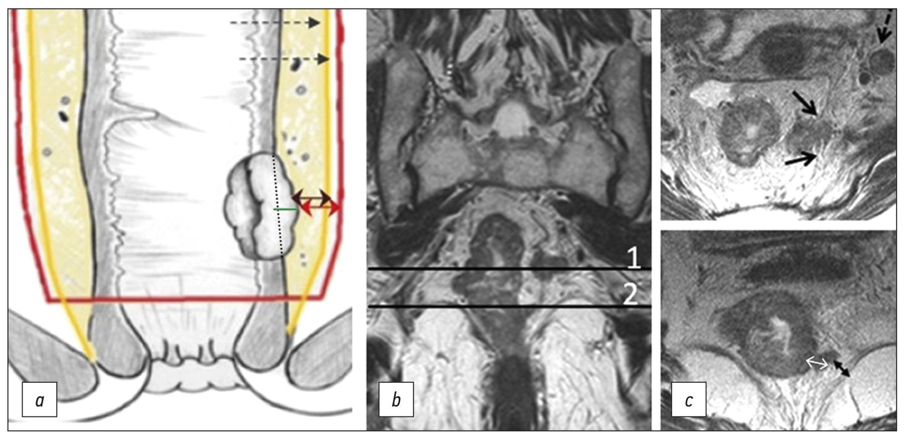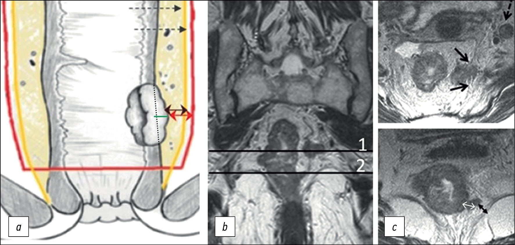 Fig. 2. Circular border (edge) of rectal resection during total mesorectumectomy. (a) Diagram showing extramural growth of the tumor (green line); mesorectal fascia (yellow line); circular border (edge) of resection (red line); distance from the tumor to the mesorectal fascia (double black arrow); distance from the tumor to the circular border (edge) of resection (double red arrow). (b) T2-weighted images in the coronal plane of the tumor of the lower ampullary part of the rectum with extramural vascular invasion and deposit at the level of axial T2-weighted images. (c) Upper axial section corresponds to the level of the deposit involving the mesorectal fascia (black arrows), extramesorectal lymph node (dotted arrow). The lower axial section corresponds to the level of extramural vascular invasion. The depth of extramural invasion (a double white arrow). The distance from the tumor to the elevator muscle of anus (a double black arrow).