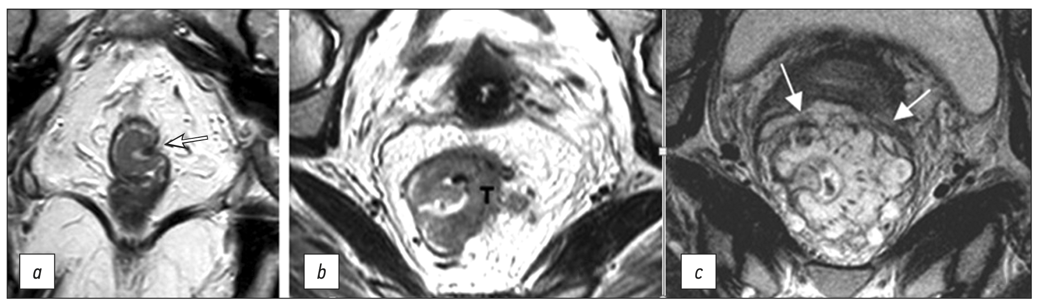 Fig. 3. Variants of tumor image on T2-WI. (a) Polypoid/exophytic tumor (arrow). (b) Semicircular tumor (T), extramural vascular invasion (arrows). (c) Mucinous tumor (arrows).