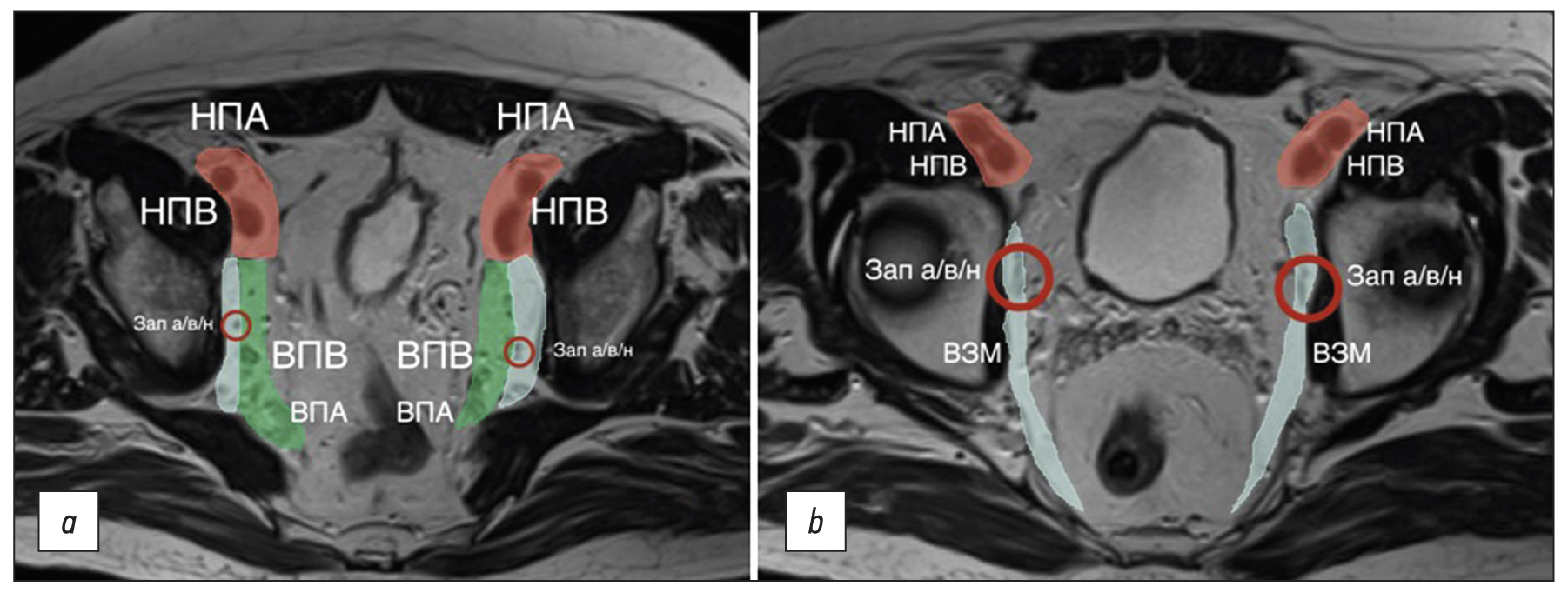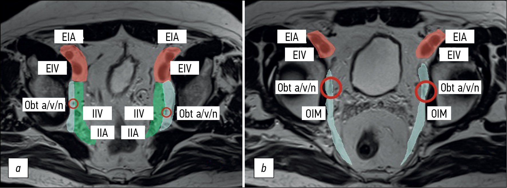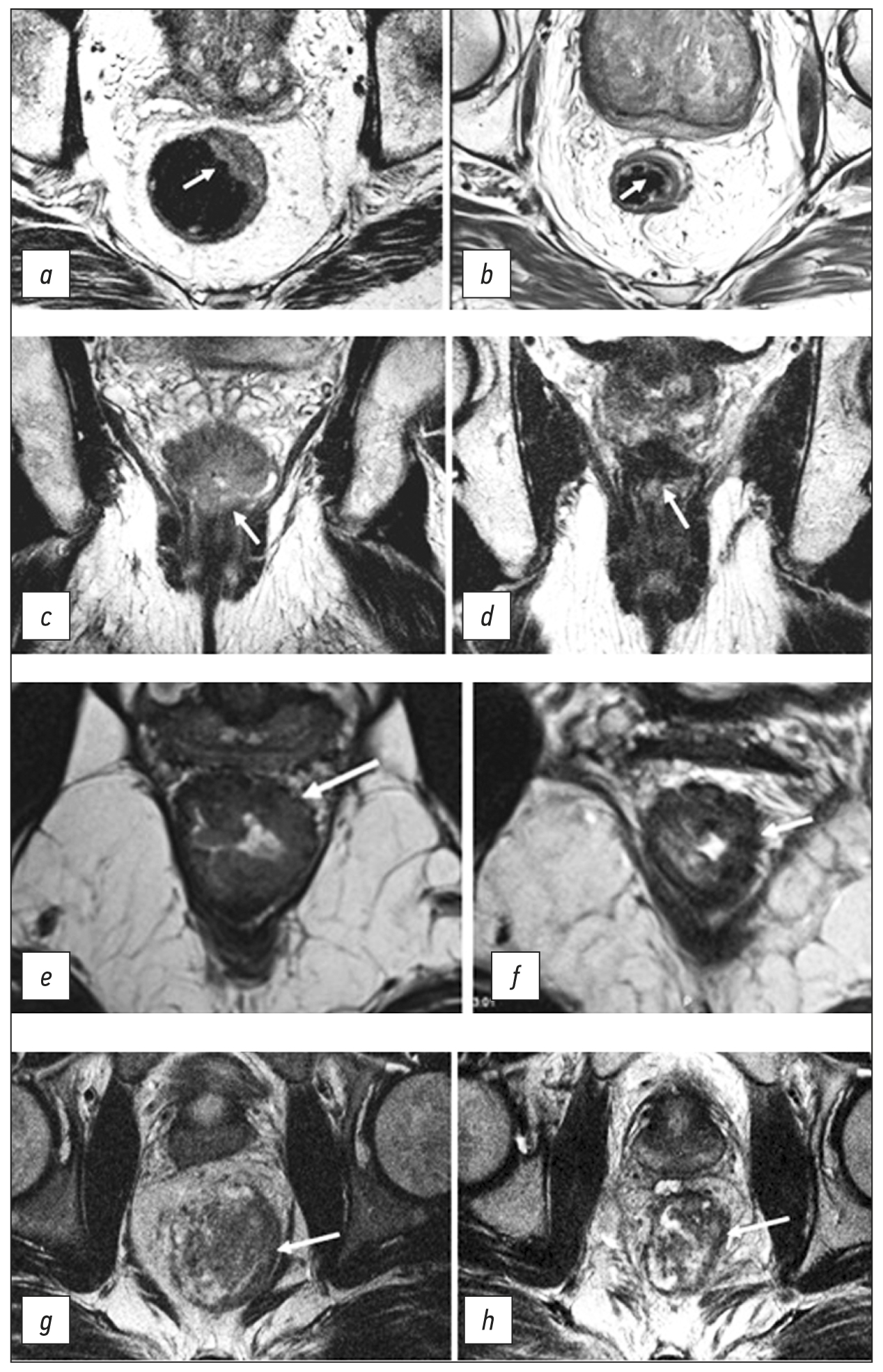 The transitional fold of peritoneum is formed at the point of transition of the peritoneum from the pelvic organs to the rectal wall, with the lower point of attachment along the anterior wall of the intestine and obliquely going up the side walls. It separates the peritonized and non-peritonized parts of the rectum. On T2-WI, it appears as a hypointense line, displaying a V-shape in the axial plane, and passes from the apex of the seminal vesicles (in men) or from the body of the uterus (in women) in the sagittal plane (Fig. 1). Lymphatic drainage from tumors located above the transitional fold of the peritoneum mainly occurs through the upper rectal and lower mesenteric lymph nodes. Tumors below the transitional fold of the peritoneum can drain through the internal iliac and obturator lymph nodes. When describing MRI findings, it is recommended to indicate the position of the tumor relative to the transitional fold of the peritoneum (completely below/crosses/completely above) [6].