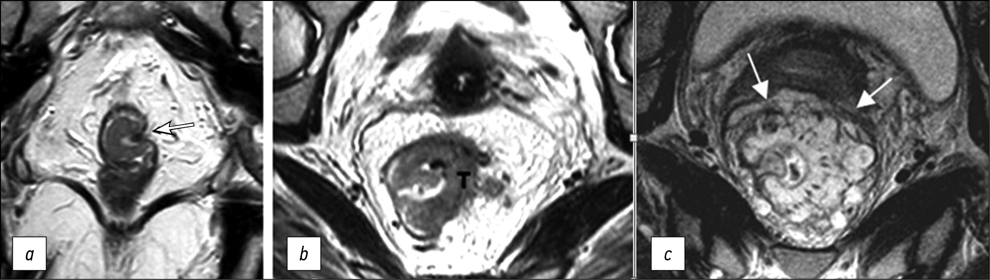 Mesorectal fascia is a thin fascial sheath that limits the rectum and the surrounding fatty tissue. On T2-WI, it appears as a hypointense circular line (Fig. 1). In men, the mesorectal fascia in front merges with the Denonvilliers’ fascia, while in women, it merges with the rectovaginal fascia (septum). At the back, it connects with the presacral fascia; it completely surrounds the rectum only to the level of the transitional fold of the peritoneum with its lateral and posterior parts above and only the posterior rectum at the level of the upper ampullary. Caudally, the mesorectal fascia passes into the intersphincteric space.