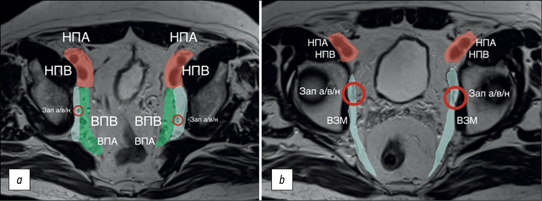 The internal anal sphincter is a continuation of the internal circular muscle layer of the rectum, comprising smooth muscle tissue. On MRI, it is determined by a significant thickening of the intrinsic muscle layer of the wall at the level of the anal canal (Fig. 1). The signal from the internal sphincter on T2-weighted images is slightly higher than that of the external sphincter, and with contrast enhancement, it appears more intense.