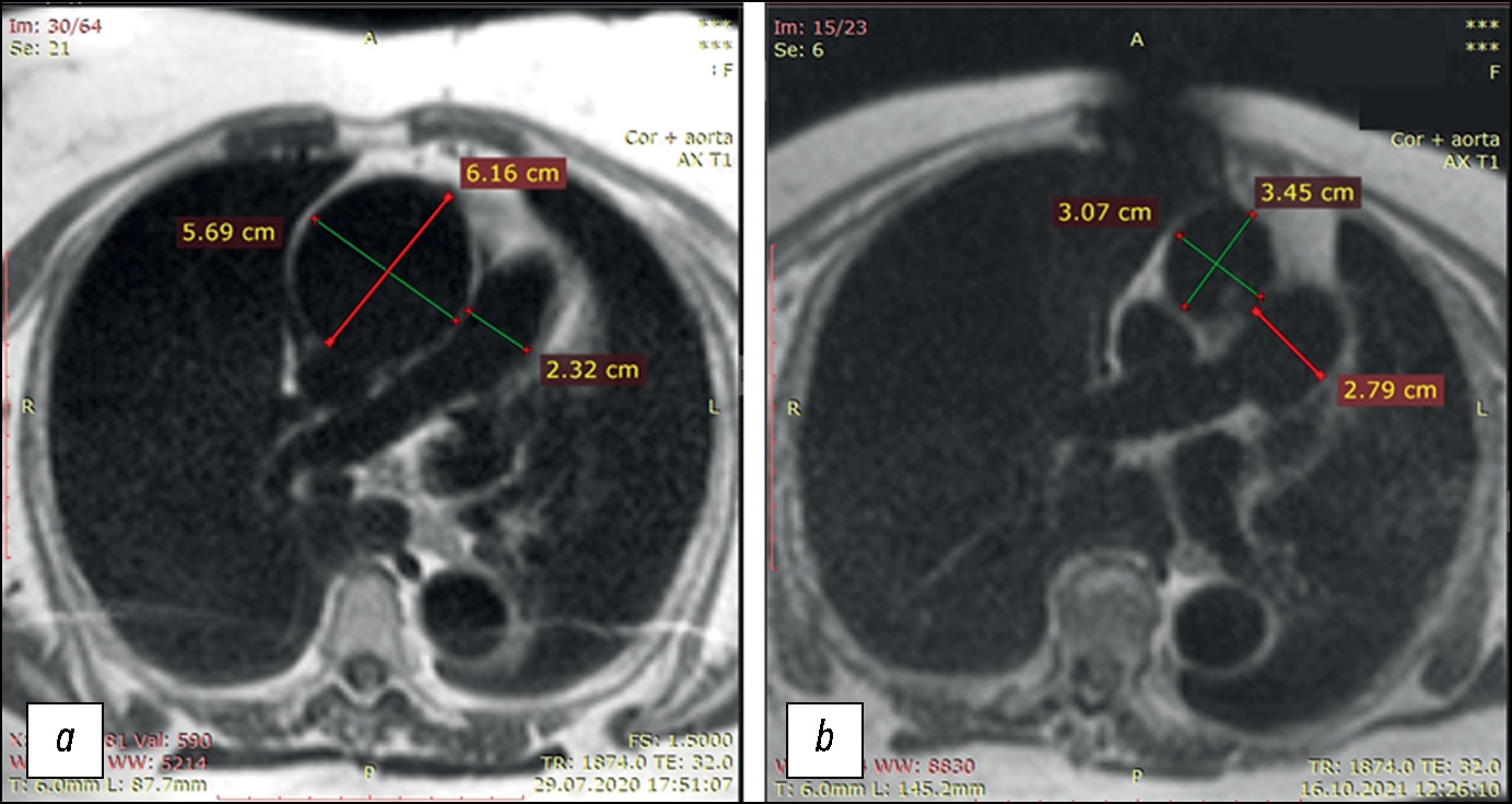 Fig.1. Transverse slices of T1-weighted images of the chest organs, including the thoracic aorta, at the pulmonary artery bifurcation level in patient B-k: (a) before prosthetic replacement of the thoracic aorta expanded due to aneurysm; critical ascending aortic aneurysm with a >6 cm lumen expansion; (b) after prosthetic replacement of the thoracic aorta expanded due to aneurysm; normal lumen of the ascending aorta. The descending aorta was normal before and after surgery. The pulmonary artery expanded to 27 mm after surgery, compared to 23 mm at admission. Postoperative tomography revealed an artifact in the chest area due to a wire fixator.