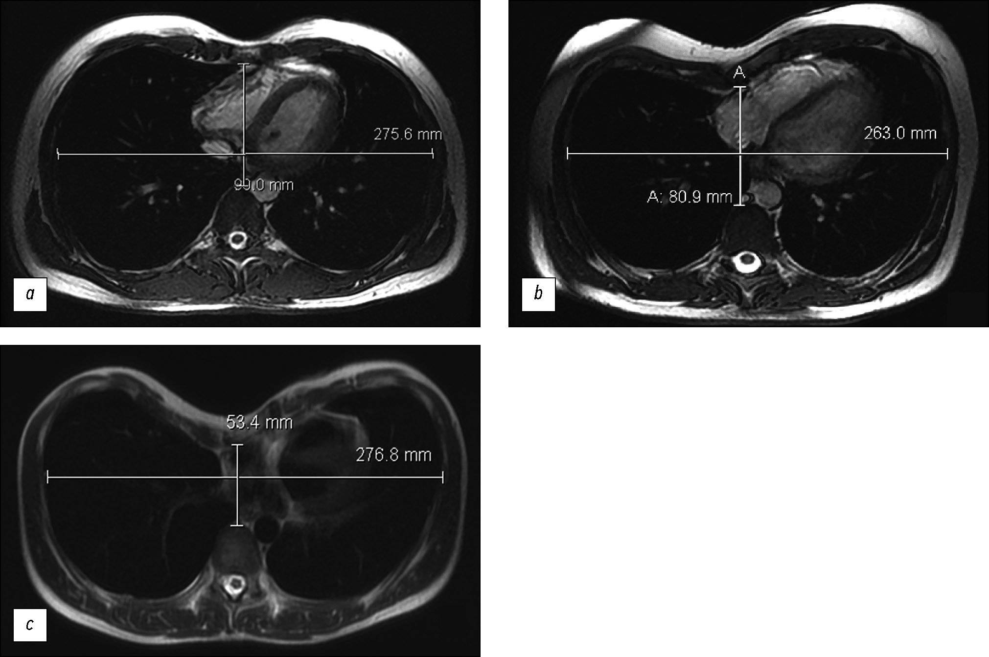 Heart MRI was performed as part of the preoperative evaluation employing a General Electric Optima MR450w GEM 1.5 T scanner (GE Healthcare, USA) with 2D-FIESTA-C pulse sequences. A functional evaluation of the left and right ventricular myocardium was incorporated into the electrocardiographic synchronization protocol. The functional examination used standard sequences to acquire cine images of the heart (balanced gradient echo) in standard cardiac axes (long 2- and 4-chamber, short 2-chamber axes). The right ventricular ejection fraction was determined in a semiautomatic mode (with manual adjustment of the values obtained) during inspiration and expiration.