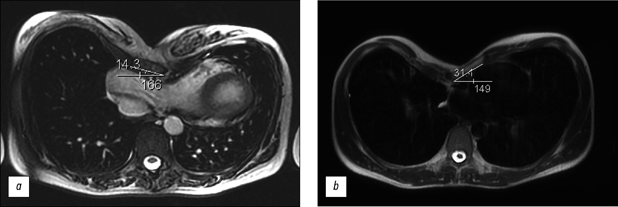 Fig. 5. Chest magnetic resonance imaging at the level of maximum deformity; (a) the sternal angle rotation of 14.3°; (b) the sternal angle rotation of 31.1°.