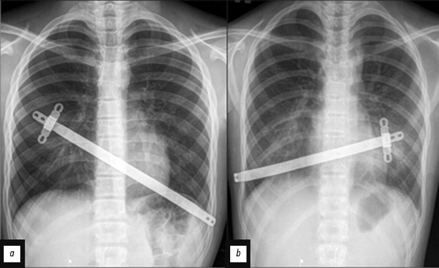 Fig. 6. Frontal chest X-ray following pectus excavatum treatment. Plates positioned if the angle opens: (a) right; (b) left.