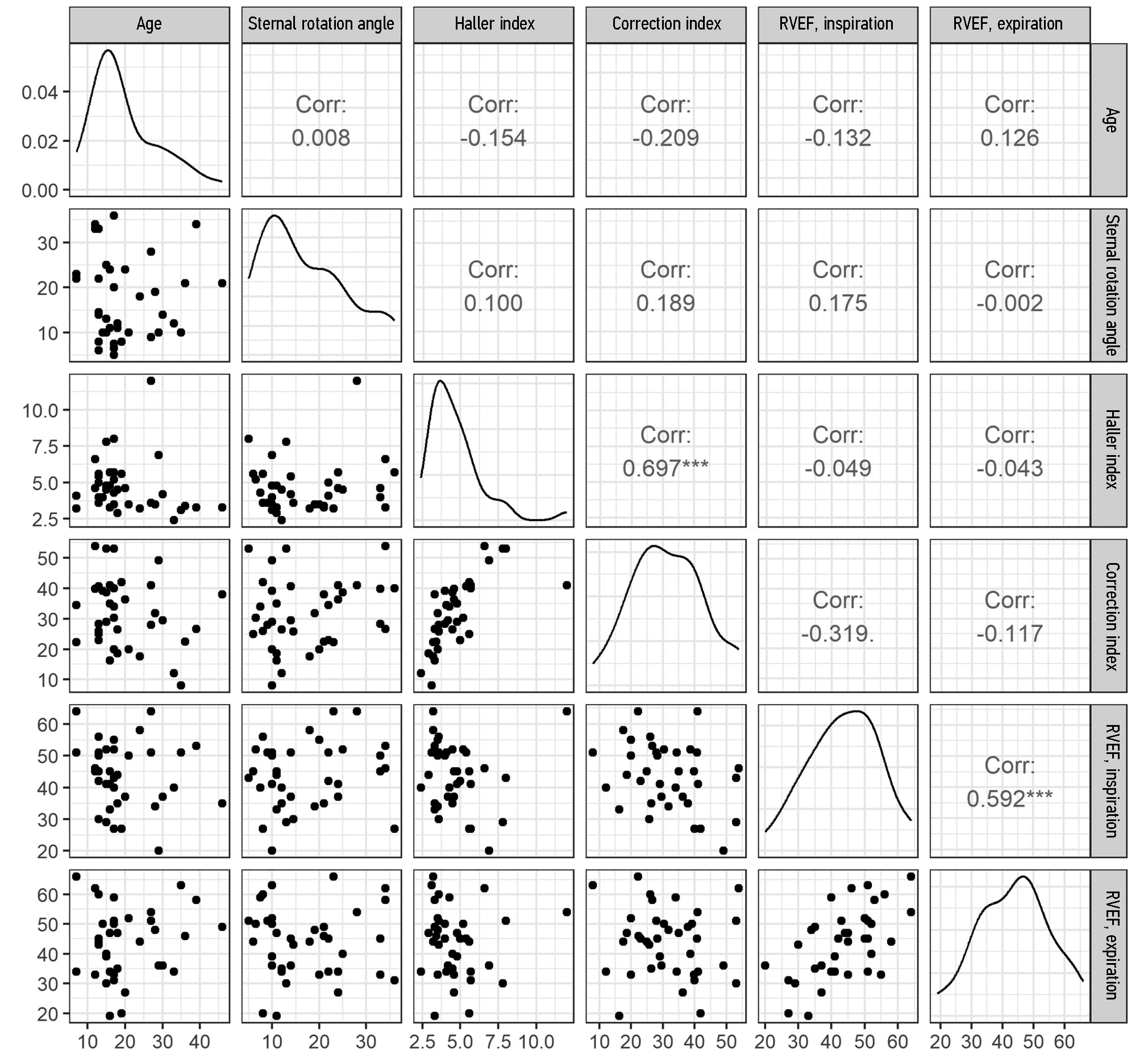 No statistically significant association was detected between the sternal rotation angle and the correction index (P = 0.35) as well as between the correction index and the right ventricular ejection fraction (P = 0.1).