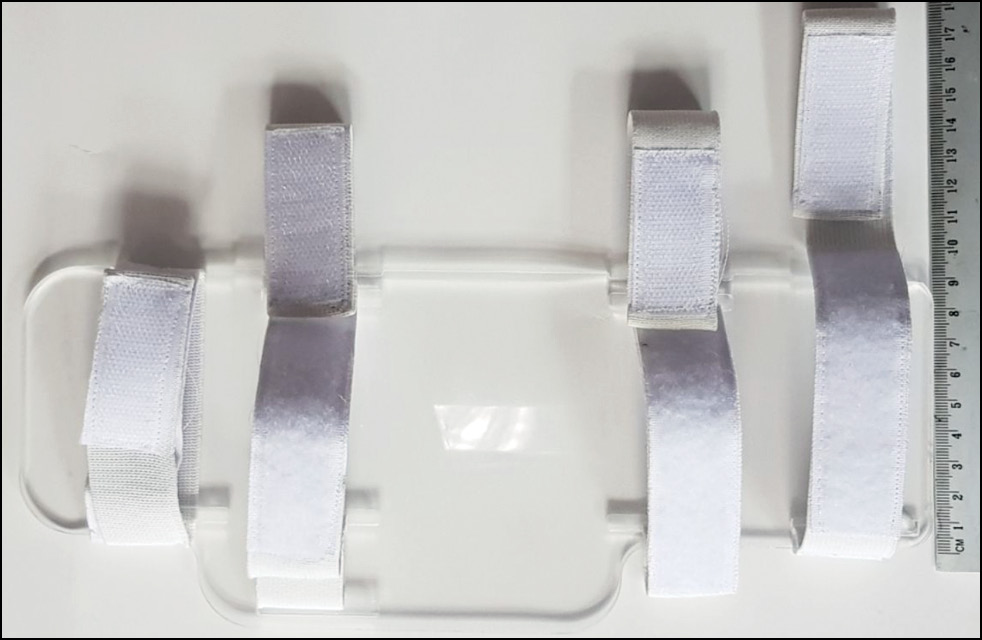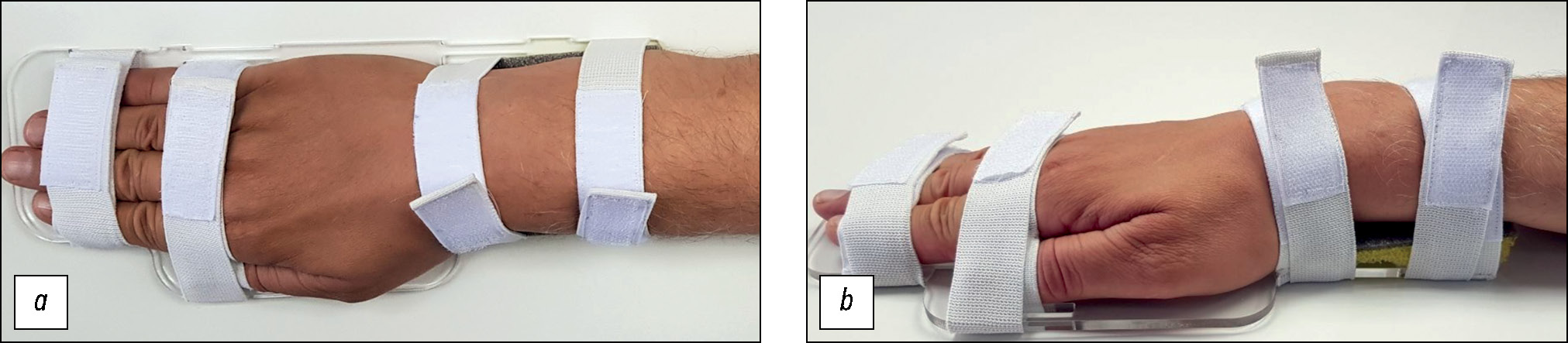 A splint made of polymethyl methacrylate (organic glass) with four textile fasteners on elastic straps was developed to immobilize the hand (Fig. 1). The splint had the dimensions 30 × 12 cm and thickness of 0.5 cm. A pad for the distal forearm (Fig. 2b) and disposable covers (gloves, sleeves) were also provided.