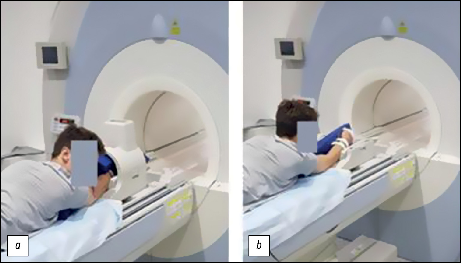 4. Fig. 3. Patient in the prone position with the arm extended forward (the superman position) and the hand placed on a splint for immobilization; (a) positioning of the device in the assembled radiofrequency coil; (b) positioning of the device in the volume radiofrequency coil with the upper part open.