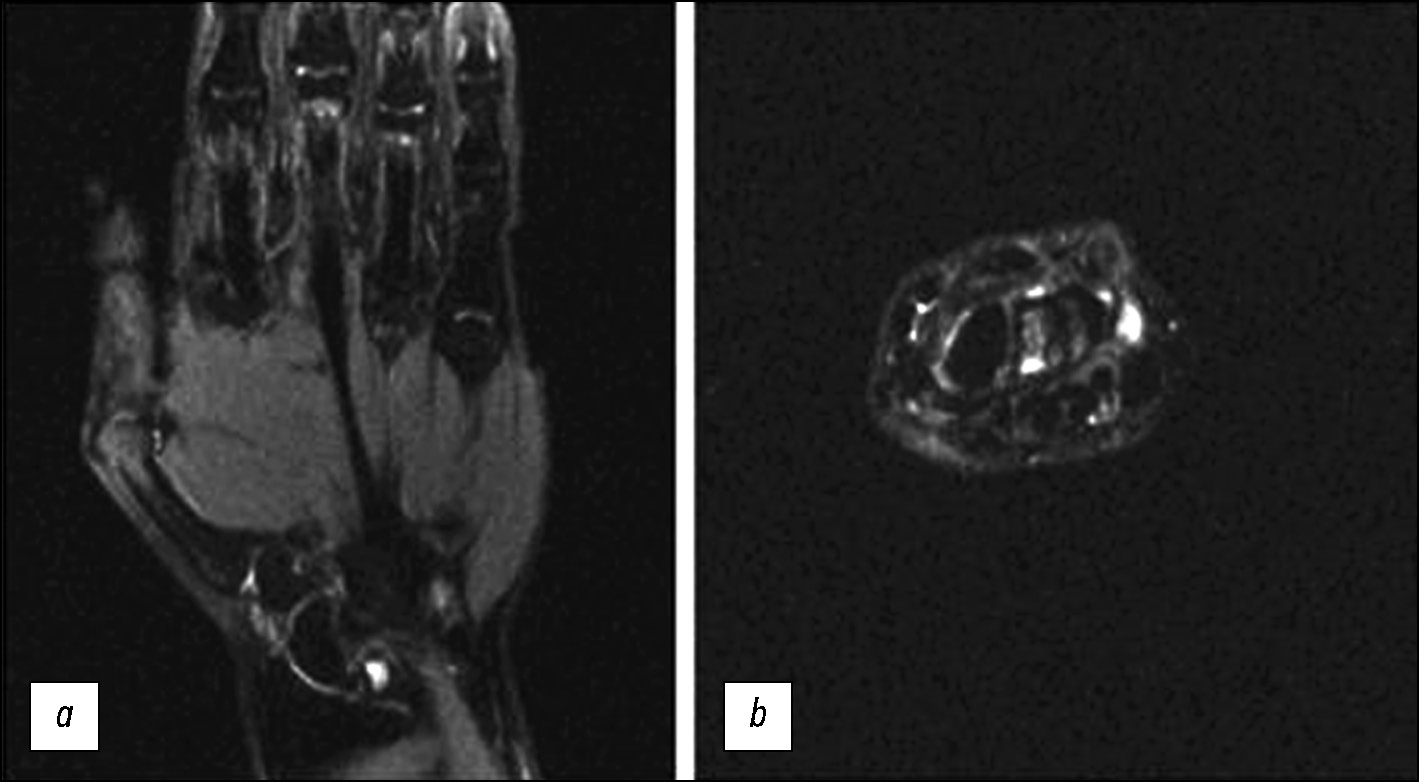 RESULTS: А head coil is more appropriate when scanning the entire hand, for example, in rheumatic diseases. A knee coil is more appropriate when studying smaller anatomical structures (including the wrist) owing to a smaller field of view and higher resolution. Based on the obtained data, guidelines for the selection of scanning parameters, sequences, and coils for magnetic resonance imaging of the hand were formulated. To prevent motion artifacts, a special fixation device of the patient’s hand was introduced.