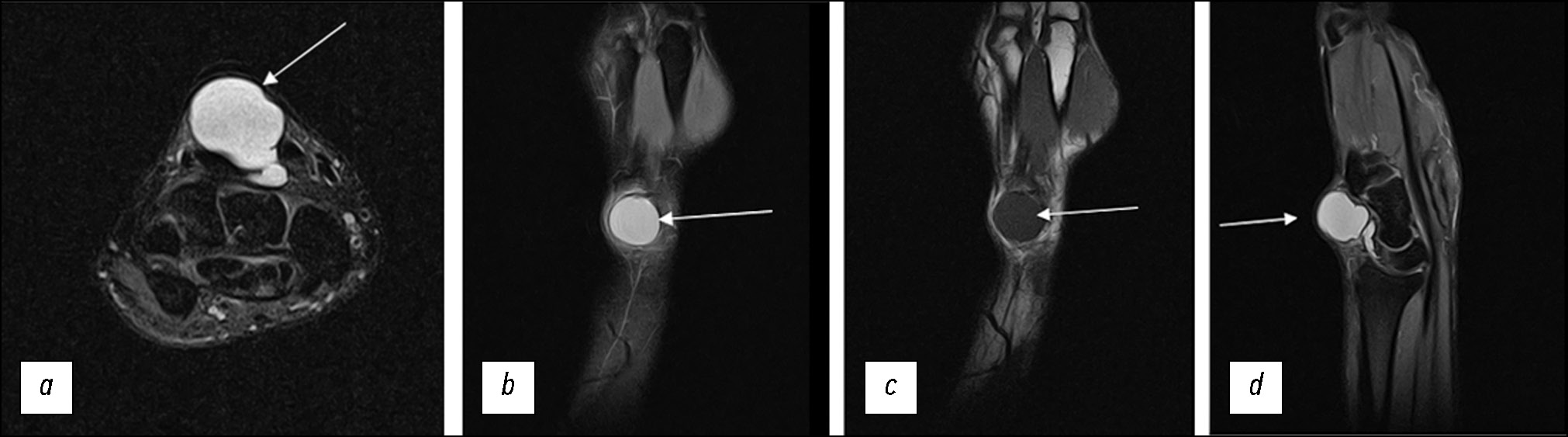 7. Fig. 6. Large encapsulated ganglion cyst of the dorsal hand with neck-like connection to the wrist cavity; (a) PD-weighted images with fat suppression in the axial plane; (b) PD-weighted images with fat suppression in the coronal plane; (c) T1-weighted images in the coronal plane; (d) PD-weighted images with fat suppression in the sagittal plane.