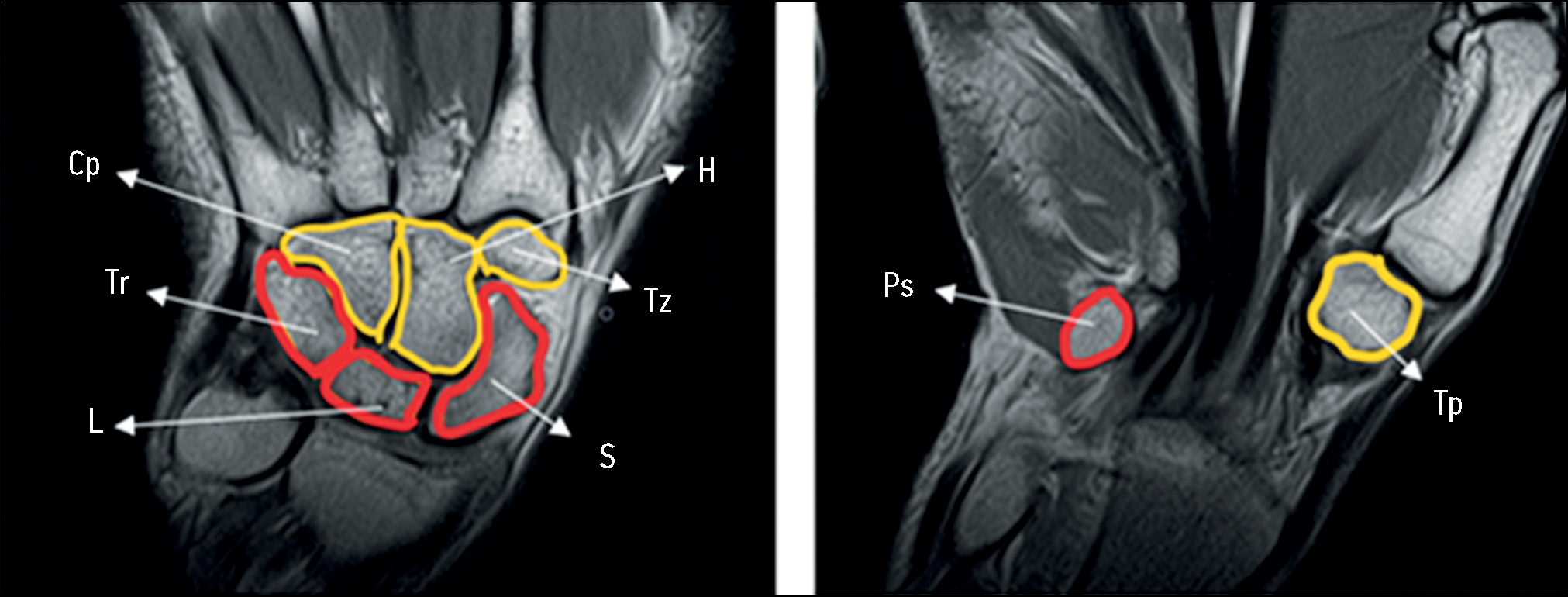 11. Fig. 7. Left hand, wrist bones, and magnetic resonance imaging (T1-weighted images, coronal plane). The proximal bone row is marked in red; the distal bone row is marked in yellow. S, scaphoid bone; L, lunate bone; Tr, triquetral bone; Ps, pisiform bone; Tp, trapezium bone; Tz, trapezoid bone; H, hamatum, Cp, capitate bone.