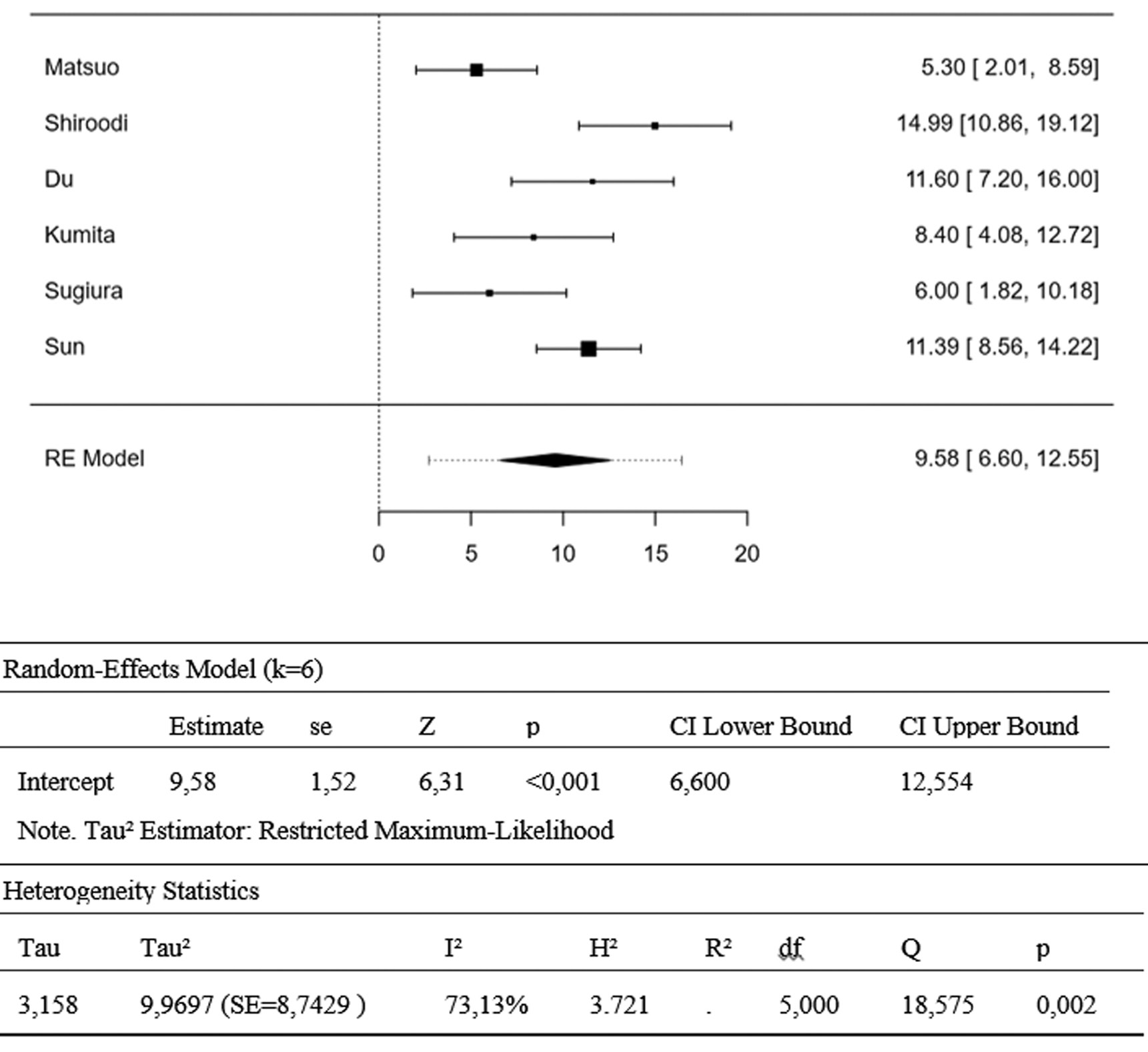 Fig. 3. Meta-analysis results (k=6 studies). Mean differences ranged from 5.3000 to 14.9900; most ratings were positive (100%). The mean difference estimate based on the random effects model was 9.5771 (95% confidence interval: 6.6001–12.5540); the mean score was significantly different from zero (z=6.3053; p<0.0001).