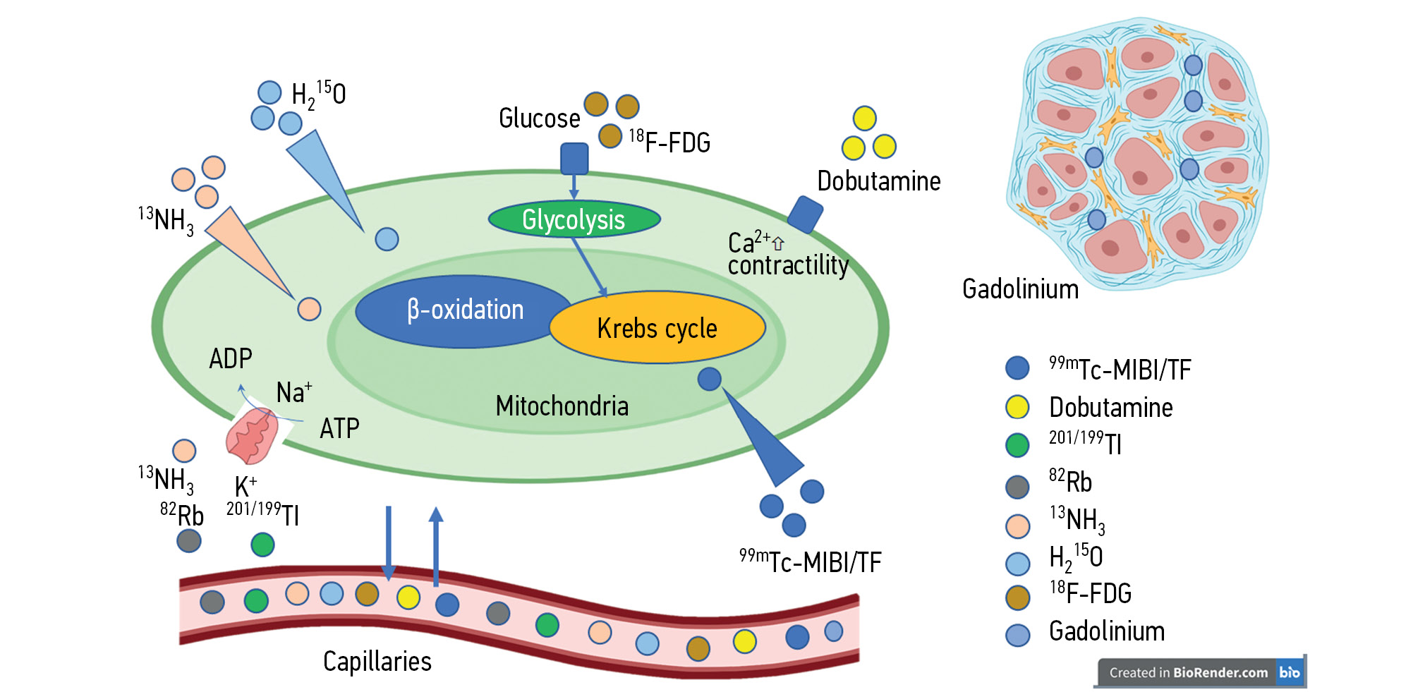 Fig. 1. Schematic depiction of the mechanism of the accumulation of various diagnostic agents in the cell and intercellular space. 201/199Tl: thallium-201 or thallium-199; its uptake is determined by membrane integrity and normal functioning of the Na+/K+ pump. 82Rb: rubidium-82; its uptake is also determined by the Na+/K+ pump. 99mTc-MIBI/TF-based tracers: lipophilic cations that freely pass through the mitochondrial membrane and are retained because of the transmembrane potential. Dobutamine stimulates β1 and β2 adrenergic receptors, increasing the intracellular calcium concentration and inotropic function of the heart. 18F-FDG: fluorodeoxyglucose accumulates in the cell via the glucose transporter protein. 13NH3: ammonium is accumulated via passive diffusion and active transport of the Na+/K+ pump. H215O: oxygen-15 labeled water readily diffuses into the cell, forming an equilibrium between the extracellular and intracellular pools. Gadolinium is an extracellular diagnostic agent that is retained in the intercellular space.