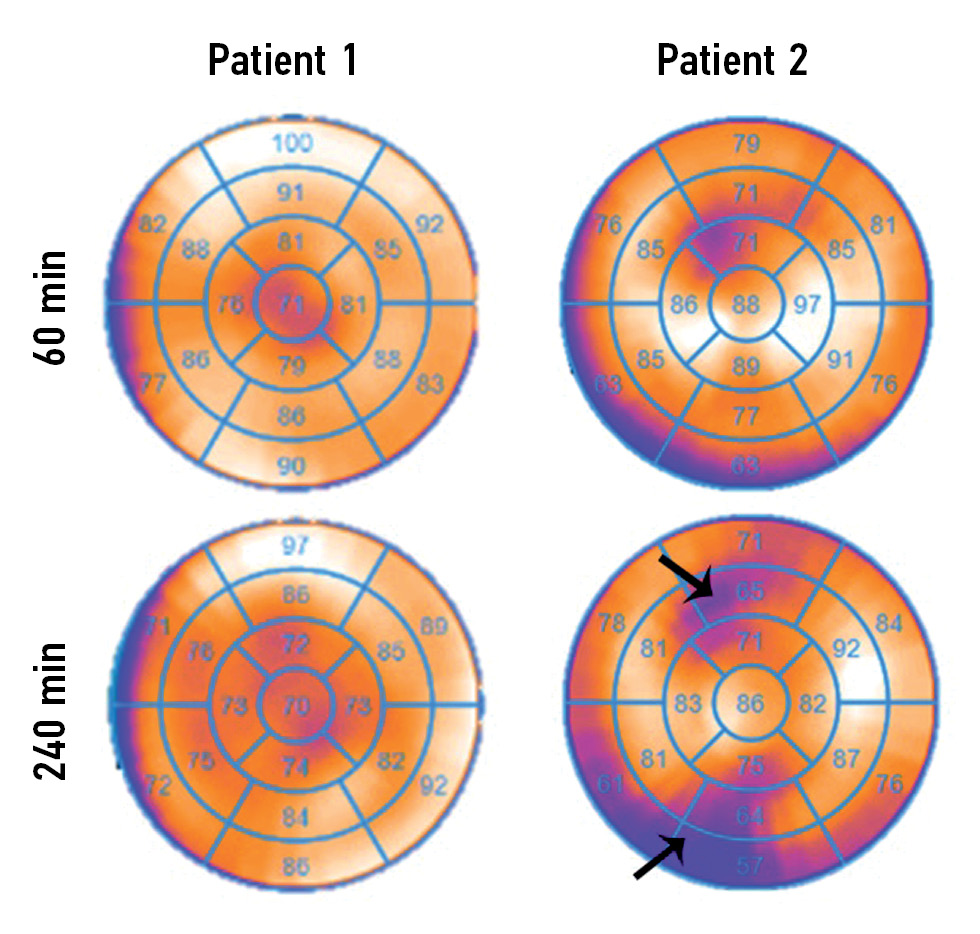 Fig. 2. An example of the absence and presence of 99mTc-MIBI reverse redistribution. Patient 1: female, 56 years old, CAD (grade II stable angina) secondary to nonobstructive coronary atherosclerosis; CHF, NYHA class II; LV ejection fraction, 64%; end-systolic volume, 42 mL; end-diastolic volume, 117 mL. Delayed imaging (240 min) revealed no perfusion defects. Patient 2: male, 58 years old; CAD (grade II stable angina); anterior descending artery stenosis, 75%; right coronary artery stenosis, 70%; CHF, NYHA class II; LV ejection fraction, 65%; end-systolic volume, 39 mL; end-diastolic volume, 112 mL. Delayed imaging (240 min) revealed perfusion defects (arrows) that were not detected during early imaging (60 min). Images were obtained at the Research Institute of Cardiology, Tomsk National Research Medical Center.