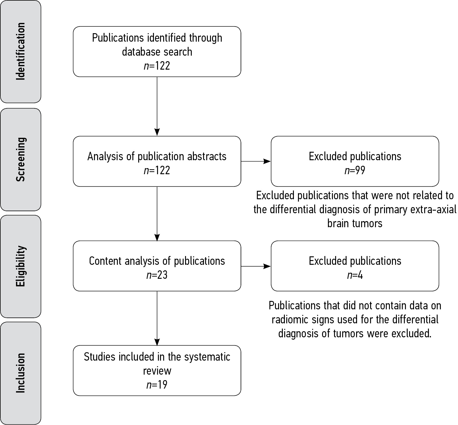 MATERIALS AND METHODS: The search for publications over the past 5 years in Russian and English was conducted in PubMed/Medline, Google Scholar, and еLibrary databases. The final analysis included 19 papers on the differential diagnosis of extra-axial tumors. The included publications provided radiomic features used for the differential diagnosis of neoplasms.