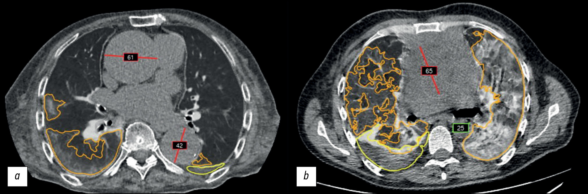 Fig. 2. An example of an algorithm operation of a complex AI-based service to process chest CT findings: a: AI technology correctly selected and marked (red line) the suspected ascending and descending thoracic aortic aneurysms; b: a false positive result: a mediastinal neoplasm was marked (red line) together with the ascending thoracic aorta; the green frame indicates the diameter of the descending thoracic aorta. This complex AI-based service has additional modules for marking pulmonary infiltrates (orange outline) and pleural effusion (yellow outline).