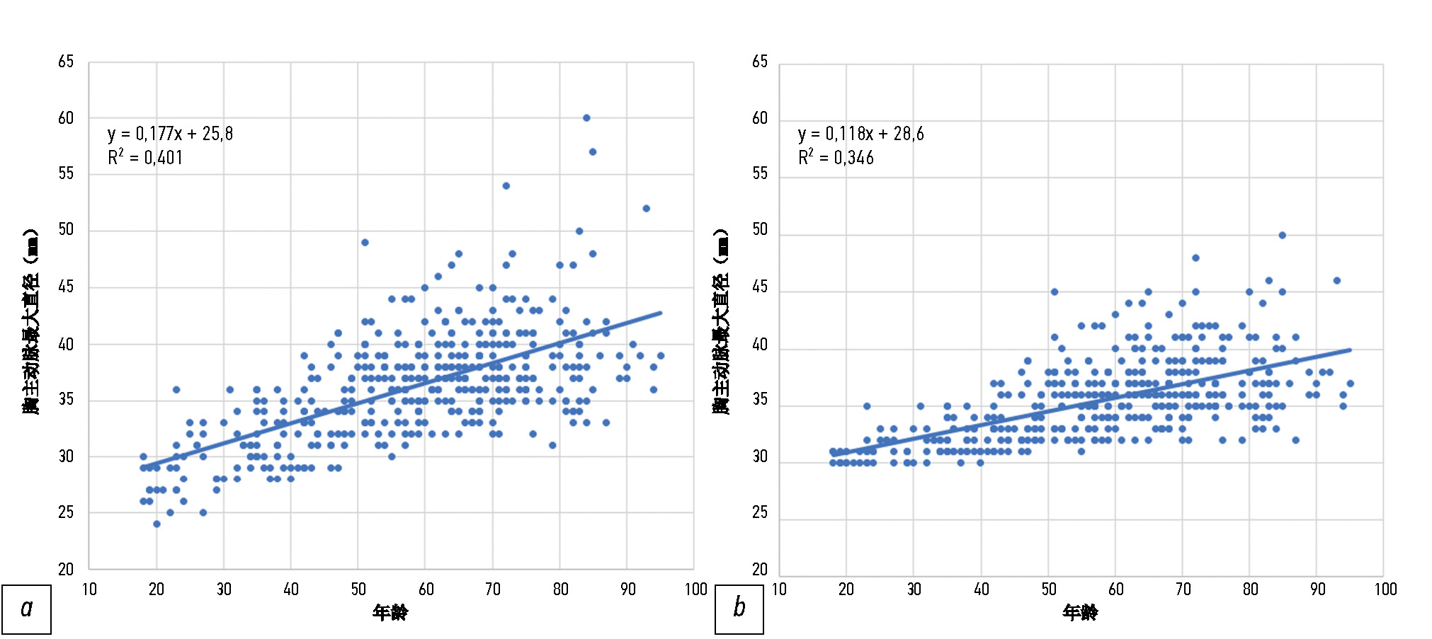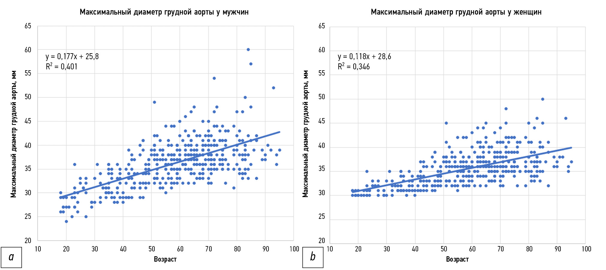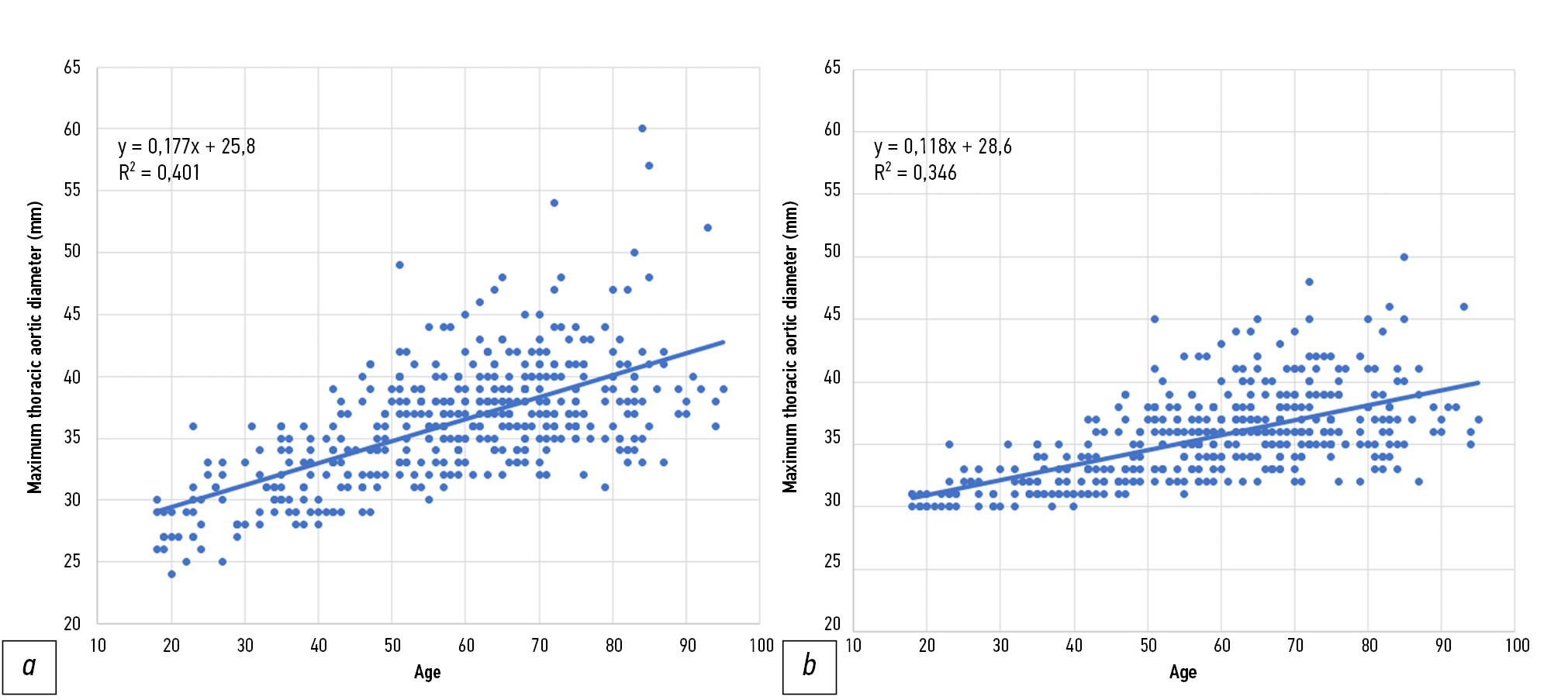 Significant (p<0.001) differences in age and maximum thoracic aortic diameter were found between the male and female patients. A pronounced association of the thoracic aortic diameter and age was found in male and female patients. In male patients, relative age-related changes in the thoracic aortic diameter are more pronounced at 0.177 mm/ year; in female patients, this parameter was 0.118 mm/year.