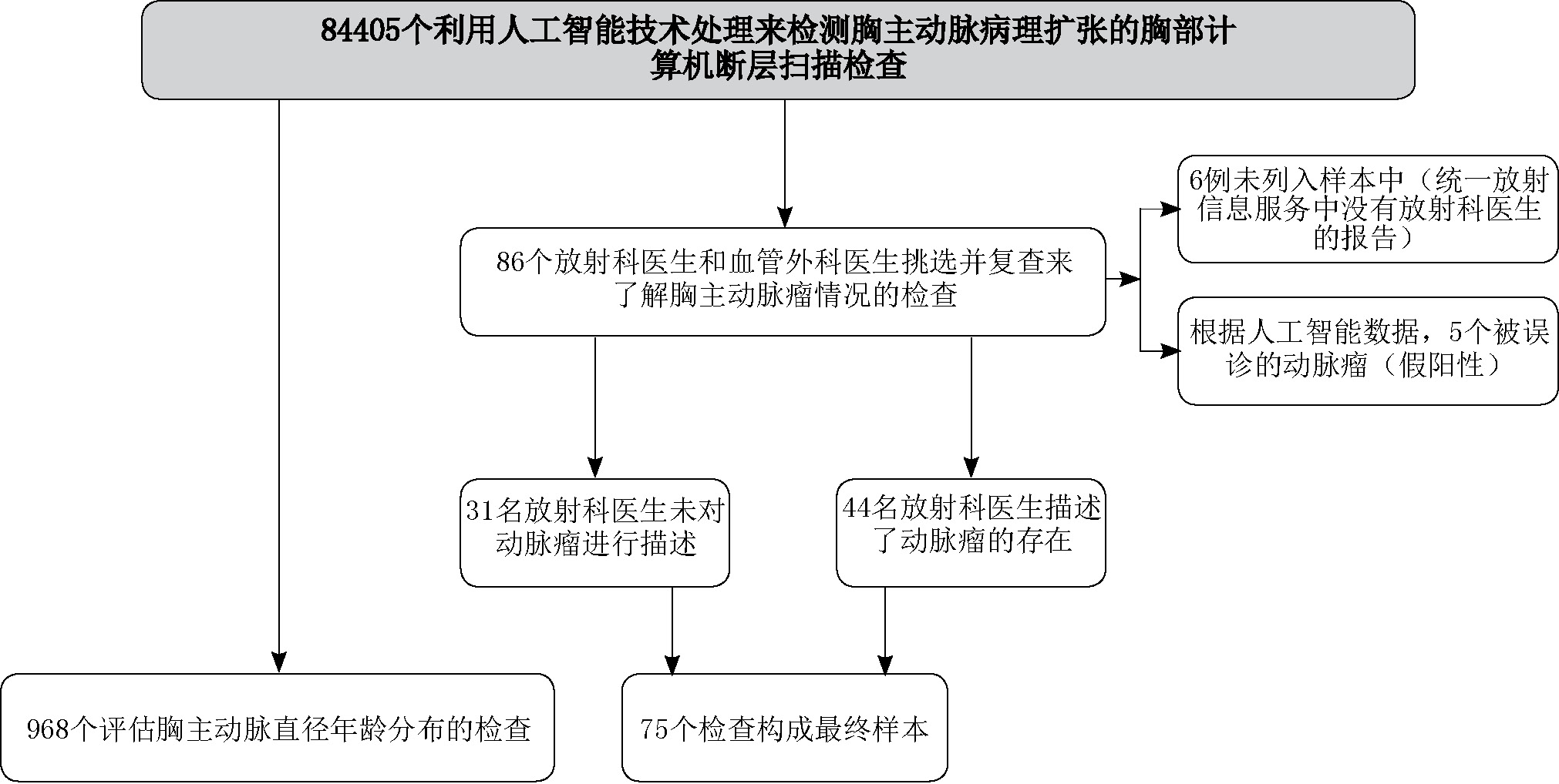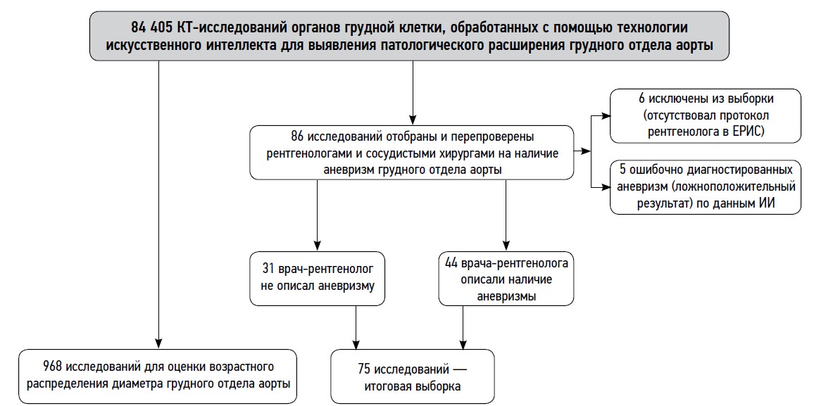 RESULTS: In 44 cases, aneurysms were initially identified by radiologists, whereas in 31 cases, aneurysms were not detected initially; however, artificial intelligence aided in their detection. Six studies were excluded, and five studies had false-positive results. Artificial intelligence aids in detecting and highlighting aortic pathological changes in medical images, increasing the detection rate of thoracic aortic aneurysms by 41% when interpreting chest computed tomography scans. The use of artificial intelligence technologies for primary interpretations of radiological studies and retrospective assessments is advisable to prevent underdiagnosis of clinically significant pathologies and improve the detection rate of pathological aortic enlargement. In the additional sample, the incidence of thoracic aortic dilation and thoracic aortic aneurysms in adults was 14.5% and 1.2%, respectively. The findings also revealed an age-dependent diameter of the thoracic aorta in both men and women.