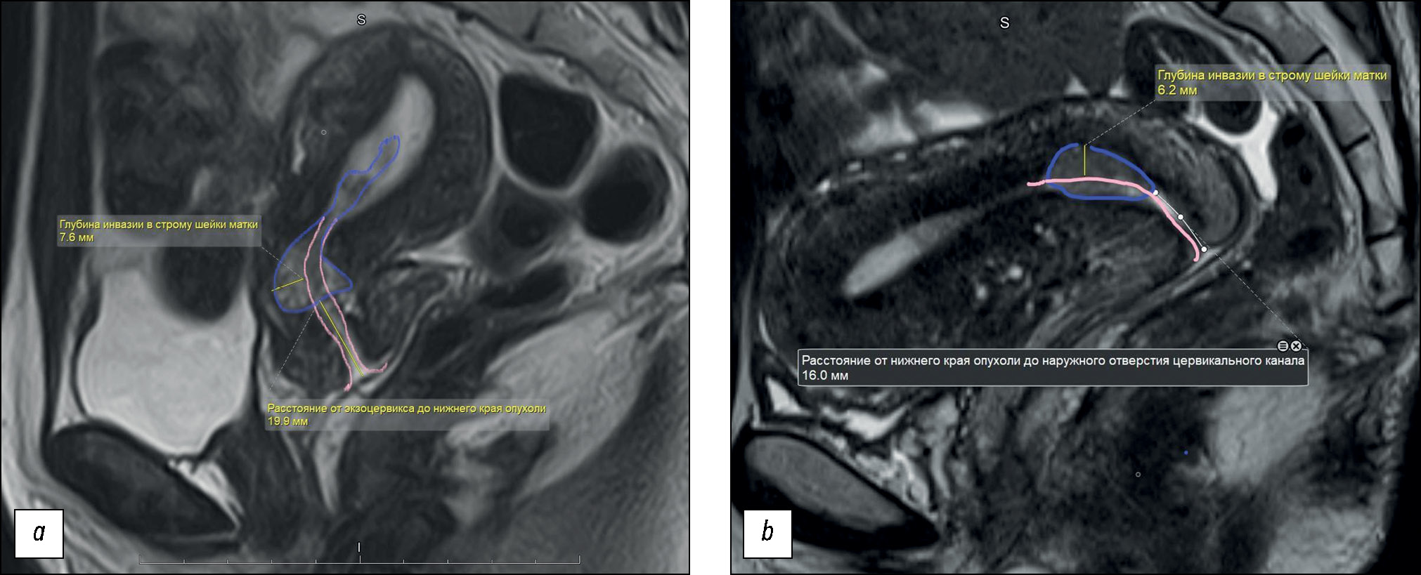 In this study, despite the high diagnostic value of MRI in detecting and assessing the extent of CC, the tumor was not visualized with multiparametric scanning tomography in 2 patients (9%) with histologically confirmed CA. This may be due to the small volume of the tumor and its lateral-spreading growth along the cervical canal and the technical limitations of this imaging modality.