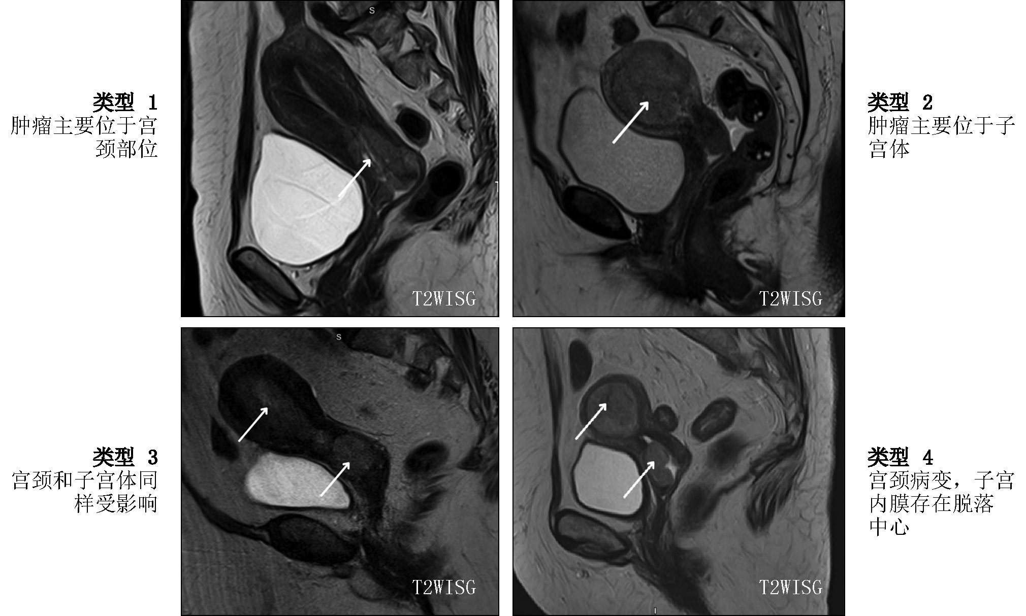 T2-WI MRI data were used to evaluate the size and depth of cervical stromal invasion (Fig. 2); the presence of parametrial invasion; involvement of the internal orifice and isthmus of the uterus, endometrial lining, uterine appendages, and lymph nodes; and the presence of a “feeding pedicle” in the tumor. The tumor pedicle was used to designate the junction between the tumor and uterine wall, considered as the tumor origin, with tumor feeding vessels visualized in the arterial and venous phases of dynamic contrast enhancement.
