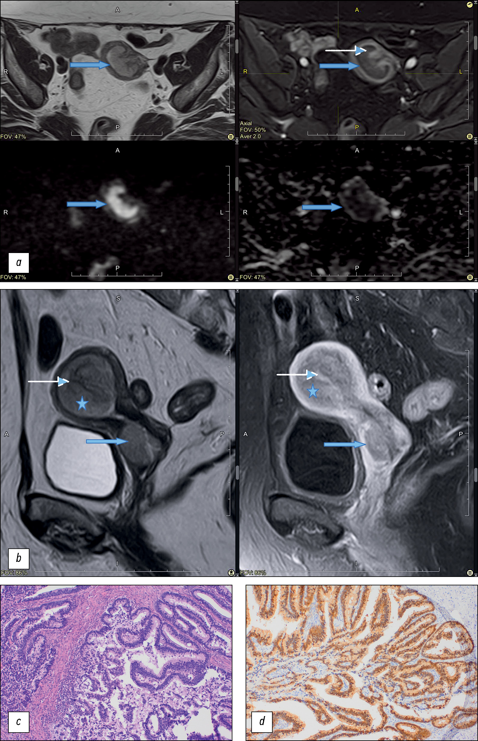 (a) from left to right and from top to bottom: T2-weighted image, T1FS-weighted image with contrast enhancement in the arterial phase, diffusion-weighted imaging (DWI), and apparent diffusion coefficient (ADC) map. The tumor (metastasis in endometrium) is marked with an arrow. The region of the “leg” of the tumor and feeding vessels are marked with a dotted arrow; (b) sagittal plane, T2-weighted image (left) and T1FS+C (right): primary tumor (arrow), metastasis in the body of the uterus (star), vessels in the focus of tumor (dotted arrow). In the arterial phase of DСE, the accumulation of paramagnetic by the basal layer of the endometrium and the vessels in the “feeding leg” of the tumor is determined; (c) histological examination of the surgical material, stained with hematoxylin and eosin, ×10; d, immunohistochemical study, expression of p16.