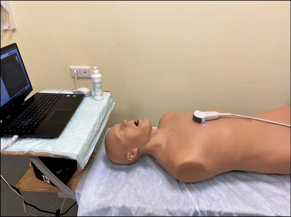 The results of using a Vimedix 3.2 virtual ultrasound simulator (CAE Healthcare, Canada) in the teaching process were analyzed. This simulator is the most widely available in both the Russian and foreign markets. It includes several mannequins and sensors for practicing ultrasound scanning techniques in various areas and an abnormal case database. The simulator includes an Omen laptop (Hewlett-Packard, USA) with wireless connection, a mouse, a male multipurpose mannequin, an array of ultrasonic convex sensor, and a sensor adapter (Fig. 1).