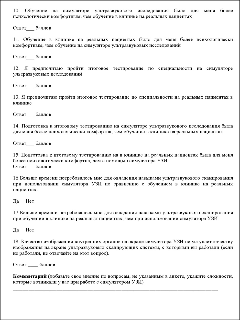 The study included 26 residents training in diagnostic ultrasonography and 37 physicians undergoing professional retraining in the same discipline. Because the study used categorical data and two answer options, this sample size was sufficient to assess the proposed teaching method and extrapolate the results to all students training in ultrasonography, during the study period and beyond. The results of using the simulator were assessed by personnel of the Department of X-ray Diagnostics and Radiation Therapy and practicing diagnosticians from the institute’s clinical sites who participated in the training and knowledge assessment.