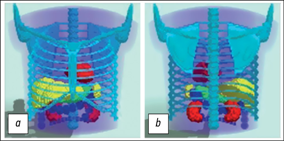 2. Fig. 1. Three-dimensional mathematical model of the torso, simulating the anatomical structure of the average male patient in a position with arms raised up: a - front view; b — rear view. The model is specified in a discrete representation of 128×128×128.