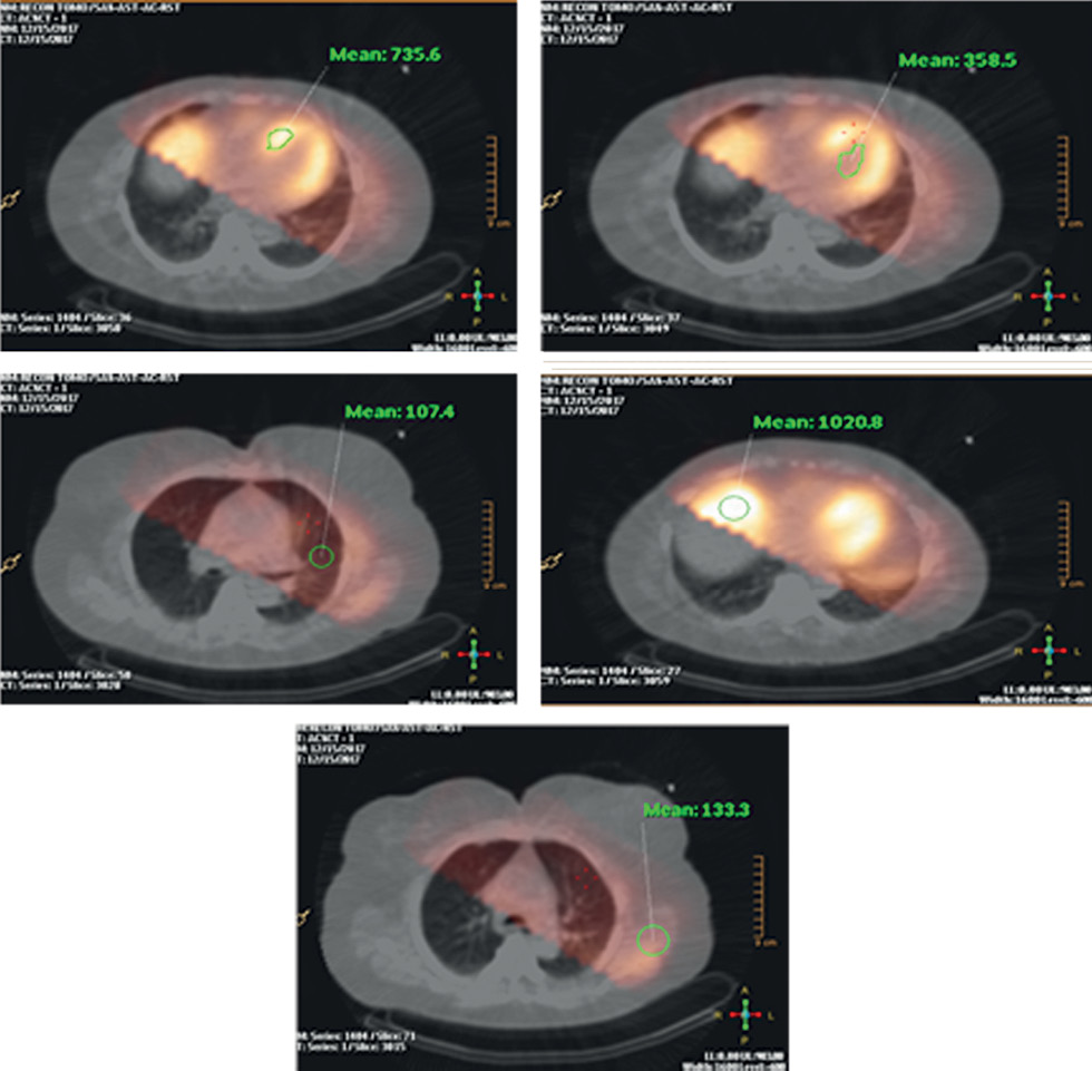 Fig. 2. Clinical data. Relative values (pulse/voxel) of accumulation of the radiopharmaceutical 99mTc-MIBI in the patient’s chest organs. The images were obtained during examination of the patient using single-photon emission computed tomography combined with computed tomography using a Philips BrightView XCT installation at the Federal State Budgetary Institution “National Medical Research Center for Cardiology named after Academician E.I. Chazov" of the Ministry of Health of the Russian Federation.