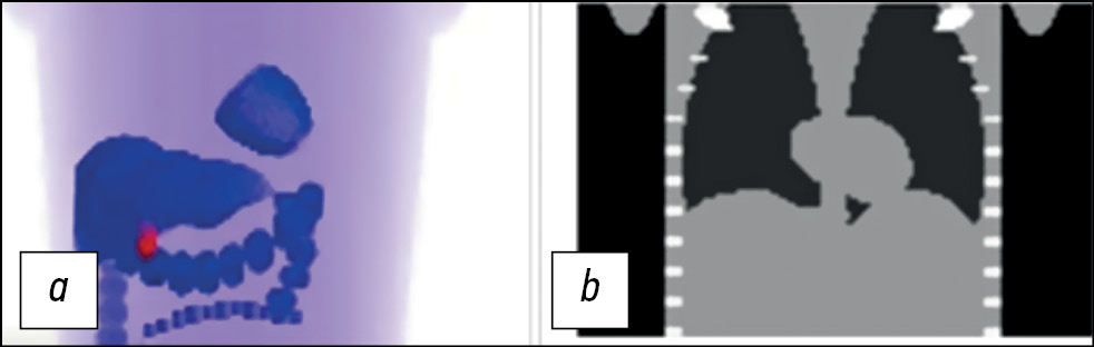 4. Fig. 3. a — radiopharmaceutical accumulation map: three-dimensional distribution of relative concentration values of 99mTc-MIBI, calculated based on a mathematical model of the torso. The map is specified in a discrete representation of 128×128×100; b - attenuation map generated based on the mathematical model of the torso. The map is specified in a discrete representation of 128×128×100. A central longitudinal section is shown.