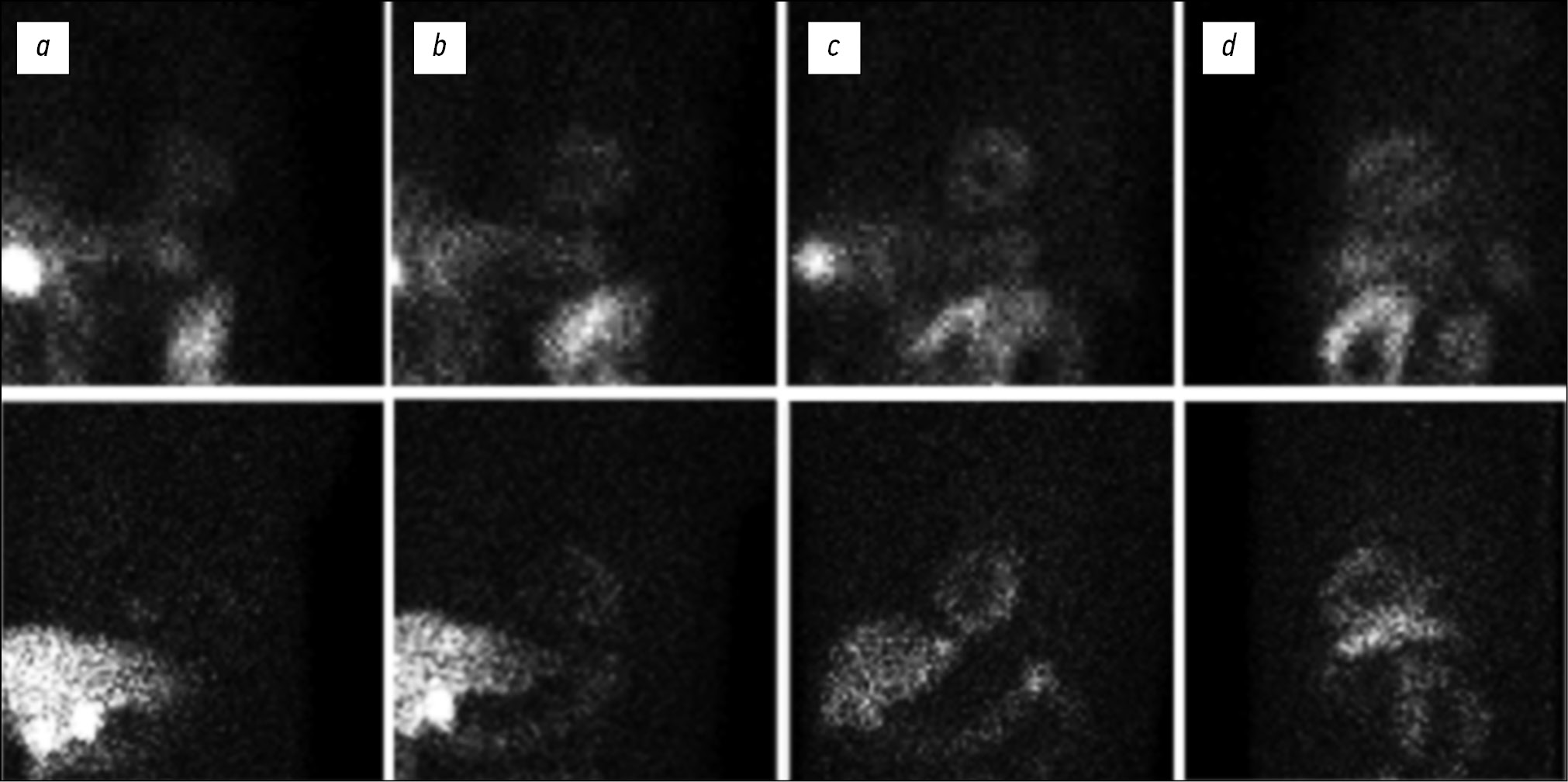 Fig. 4. Comparison of projections obtained in a clinical setting when examining a patient (top) and calculated by the Monte Carlo method (bottom) using a three-dimensional activity map of a virtual patient: a - left anterior oblique projection; b — frontal projection; c — right anterior oblique projection; d — left lateral projection. Clinical data were obtained during examination of a patient using single-photon emission computed tomography using a Philips BrightView XCT installation at the Federal State Budgetary Institution “National Medical Research Center for Cardiology named after Academician E.I. Chazov" of the Ministry of Health of the Russian Federation.