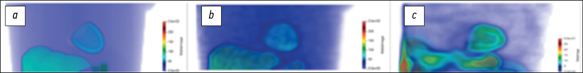 Fig. 5. Distribution of the radiopharmaceutical 99mTc-MIBI in the chest organs: a - phantom; b - reconstruction; c — clinical case. A clinical case was obtained during examination of a patient using single-photon emission computed tomography at the Federal State Budgetary Institution “National Medical Research Center for Cardiology named after Academician E.I. Chazov" of the Ministry of Health of the Russian Federation.