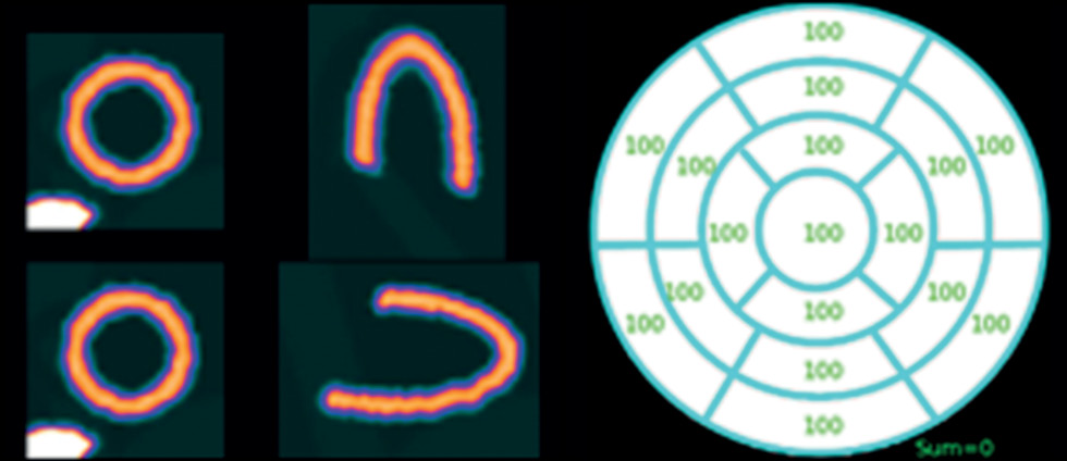 SPECT imaging assesses heterogeneous radiopharmaceutical uptake in left ventricular (LV) cardiomyocytes. Slices and “polar maps” are used to visualize the LV. A polar map is a graphical digital representation of the entire surface of the LV myocardium in a single planar image that enables measurement of normal perfusion areas and the extent and severity of damage. Three commercial software packages were developed to display the LV as a polar map: