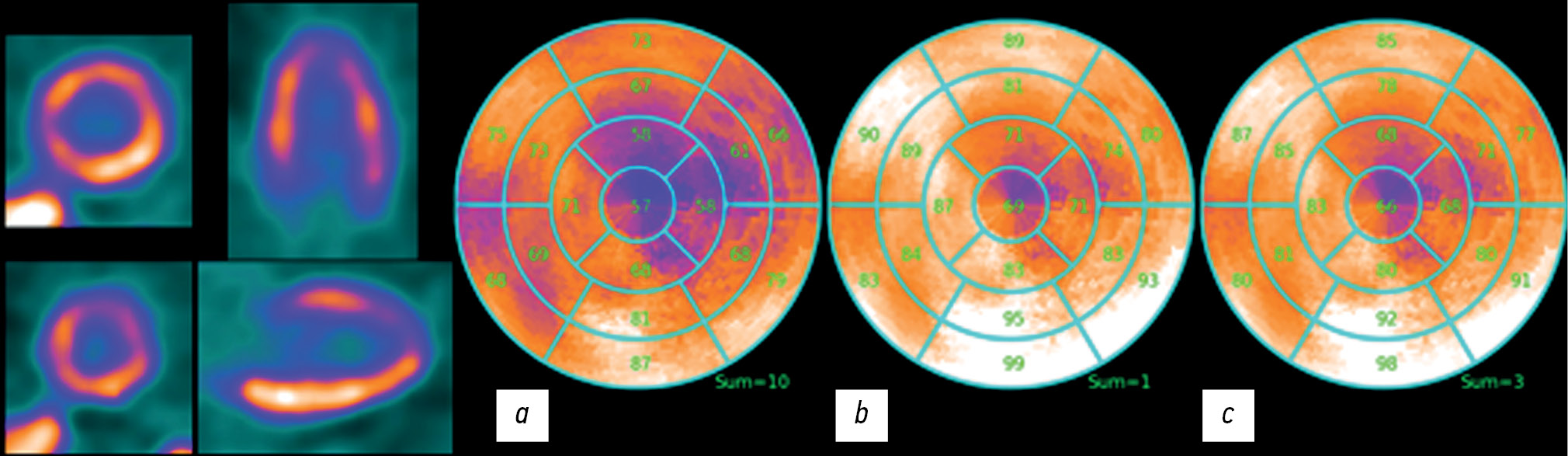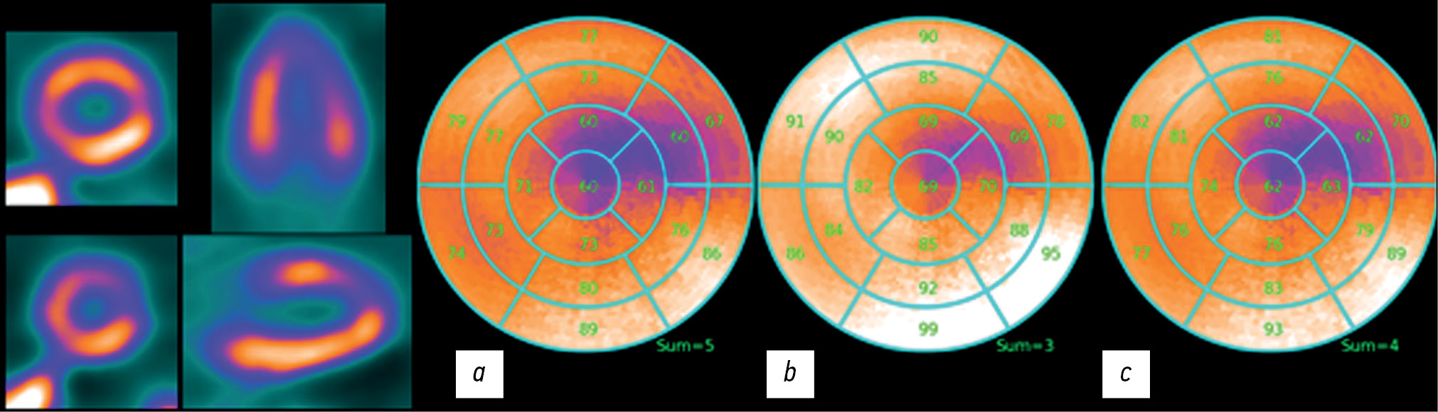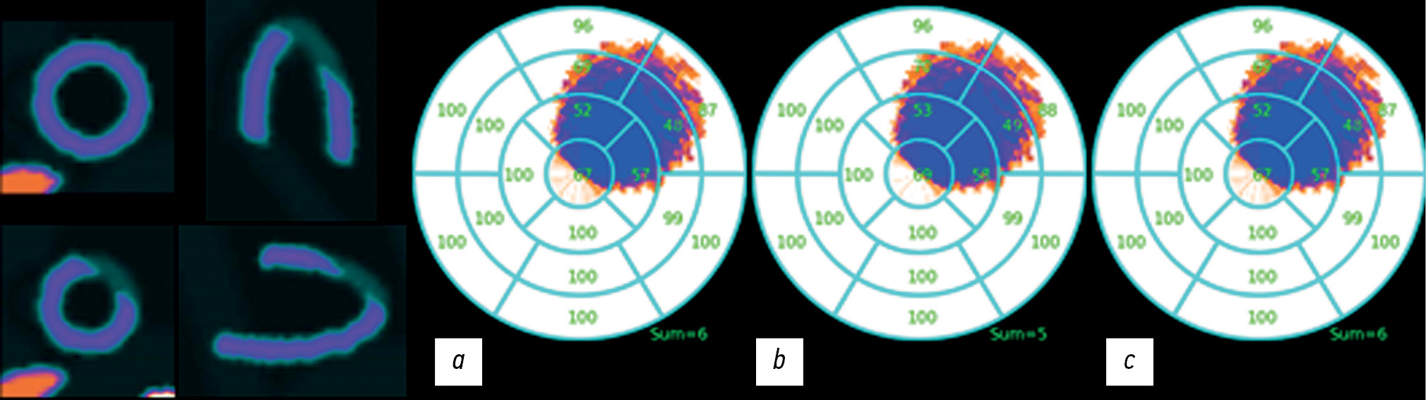 Fig. 6. Graphical presentation of the results of a clinical examination of myocardial perfusion using single-photon emission computed tomography. The images were obtained using the QPS software package when examining a patient at the Federal State Budgetary Institution “National Medical Research Center for Cardiology named after Academician E.I. Chazov" of the Ministry of Health of the Russian Federation.