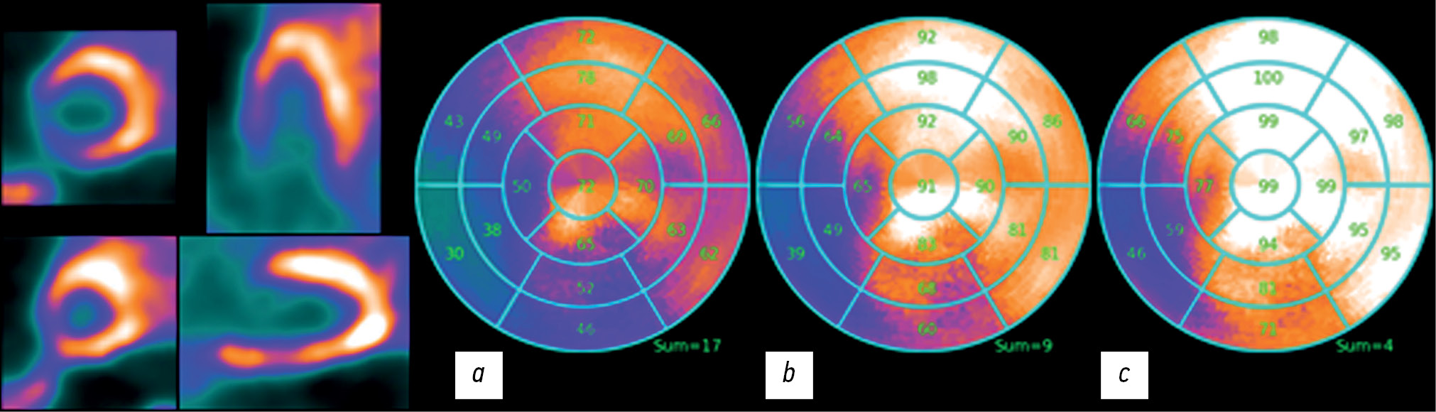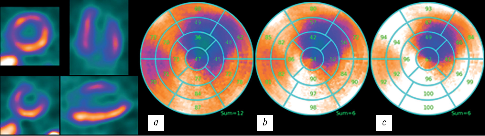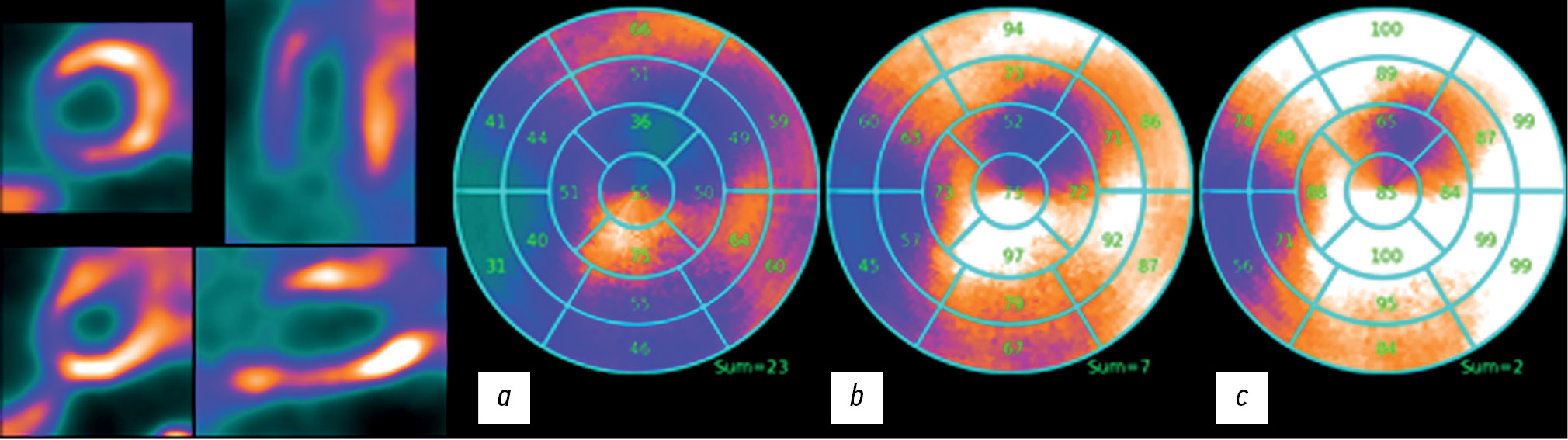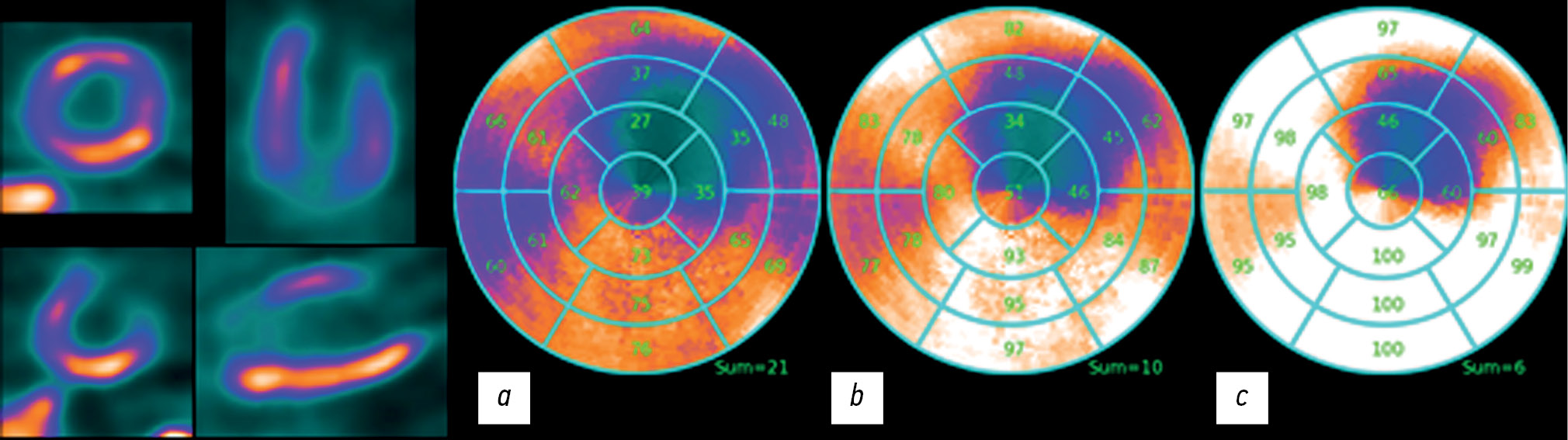 Fig. 6. Graphical presentation of the results of a clinical examination of myocardial perfusion using single-photon emission computed tomography. The images were obtained using the QPS software package when examining a patient at the Federal State Budgetary Institution “National Medical Research Center for Cardiology named after Academician E.I. Chazov" of the Ministry of Health of the Russian Federation.