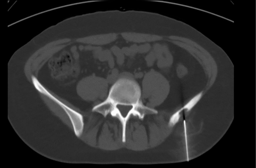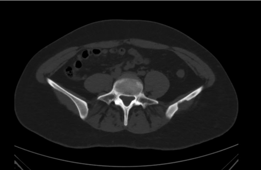 Fig. 1. Computed tomography reveals an osteolytic focus in the wing of the left iliac bone.