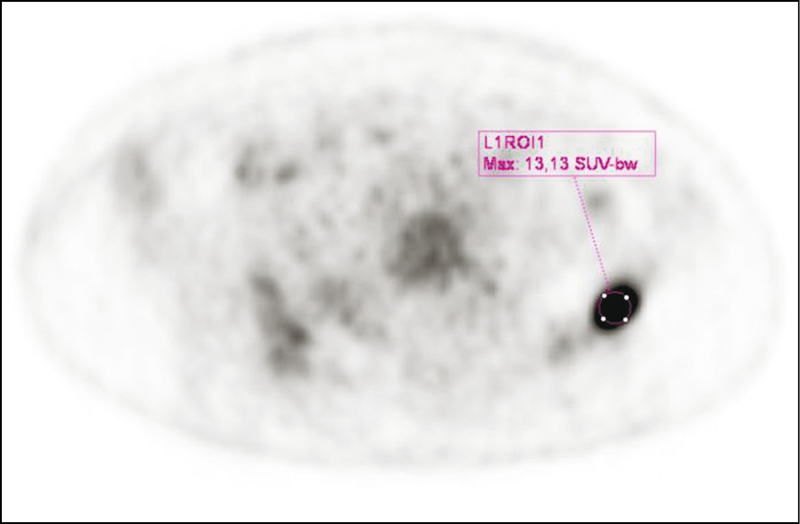 Fig. 2. A hypermetabolic focus in the projection of the wing of the left iliac bone on mono-mode positron emission tomography with 18F-fluorodeoxyglucose.
