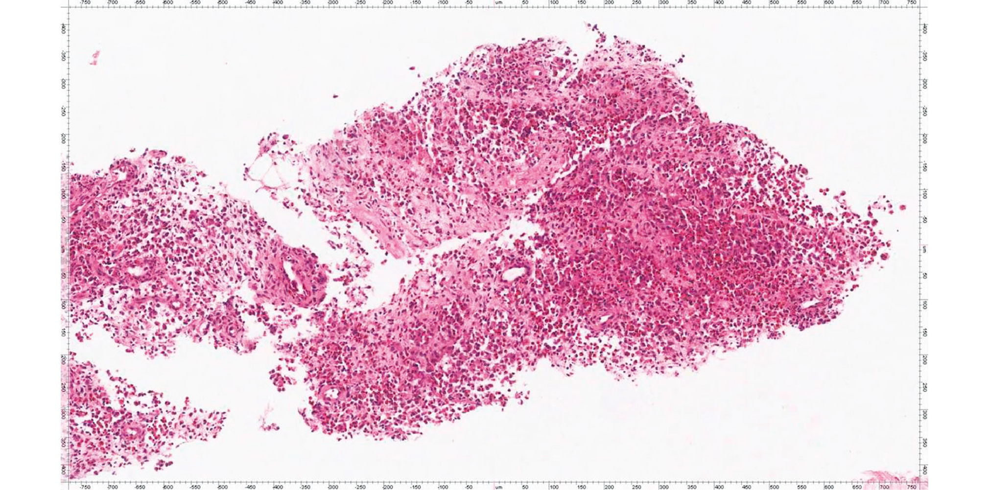 CT-guided 18G needle biopsy was performed from the wing formation of the left iliac bone (Fig. 3). The histological study (No. 2017-10802-01) concluded on the morphoimmunohistochemical presentation, which is most consistent with Langerhans cell histiocytosis (eosinophilic granuloma, histiocytosis X) (Fig. 4).
