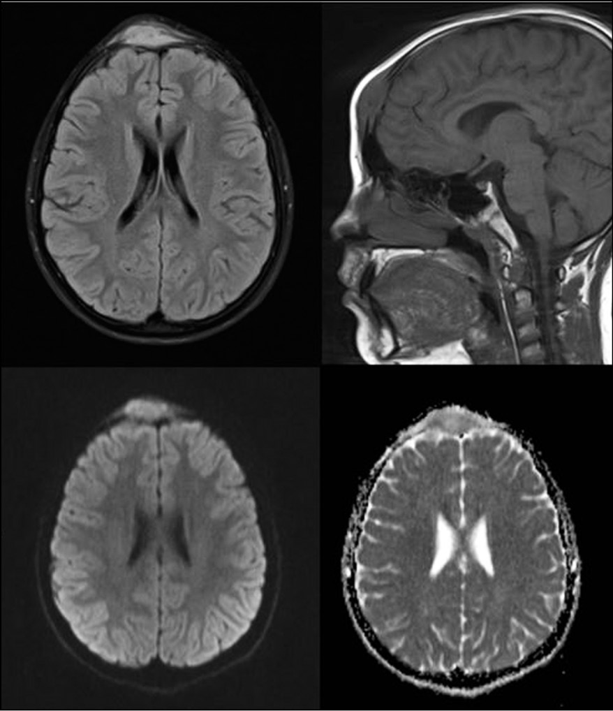 Fig. 5. Magnetic resonance imaging of the head. Top row from left to right: T2-TIRM, T1-WI; bottom row from left to right: diffusion-weighted image (B-factor 800 mm2/s), measured diffusion coefficient. Subcutaneous space-occupying lesion of increased signal in T2-TIRM, isointense in T1-WI, with signs of diffusion restriction.