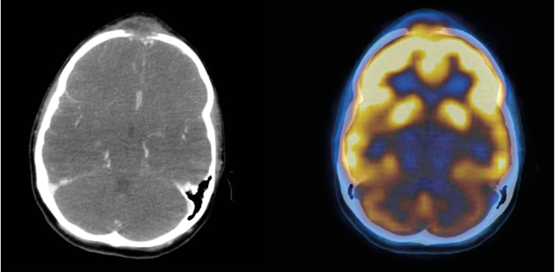 Fig. 6. Positron emission tomography with 18F-fluorodeoxyglucose, combined with computed tomography. Left: computed tomography with intravenous contrast enhancement; right: combined image of positron emission and computed tomography. A hypermetabolic focus with destruction of the external and internal cortical lamina of the frontal bone is visible.