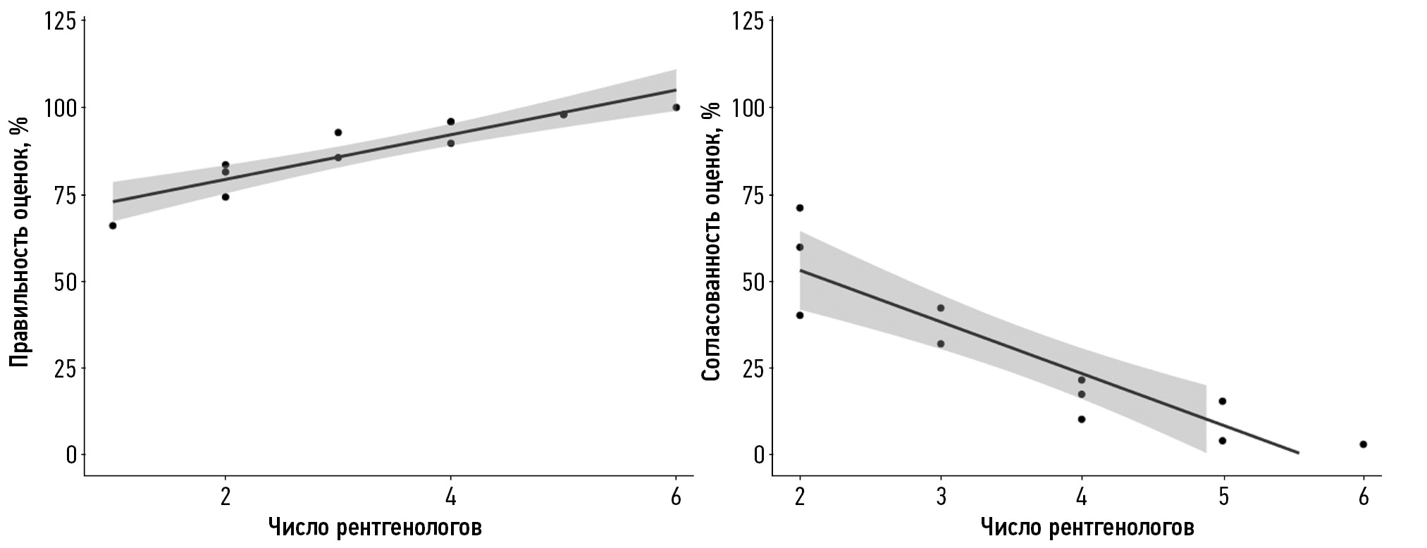 Despite its limitations, this work demonstrated convincingly that an increase in the number of independent primary interpretations can increase their accuracy, if the arbitration is performed. In addition, the qualifications of radiologists are not the decisive factor of the quality of their analysis because according to the results obtained, the joint accuracy of their assessments was independent of individual Youden’s indices. The optimal combination of accuracy and cost of tagging was achieved during the initial independent interpretation of CT examinations by four experts. This statement created a theoretical basis for the development of requirements for artificial intelligence algorithms intended for use in the diagnosis of diseases by tagging suspicious structures on CT scans, guiding and attention of radiologists. In addition, the results obtained in this work enable the substantiation of the project model for crowd-tagging of datasets, in which an increase in the number of taggers will lead to a decrease in agreement and a simultaneous increase in the quality of the final product, given arbitration.