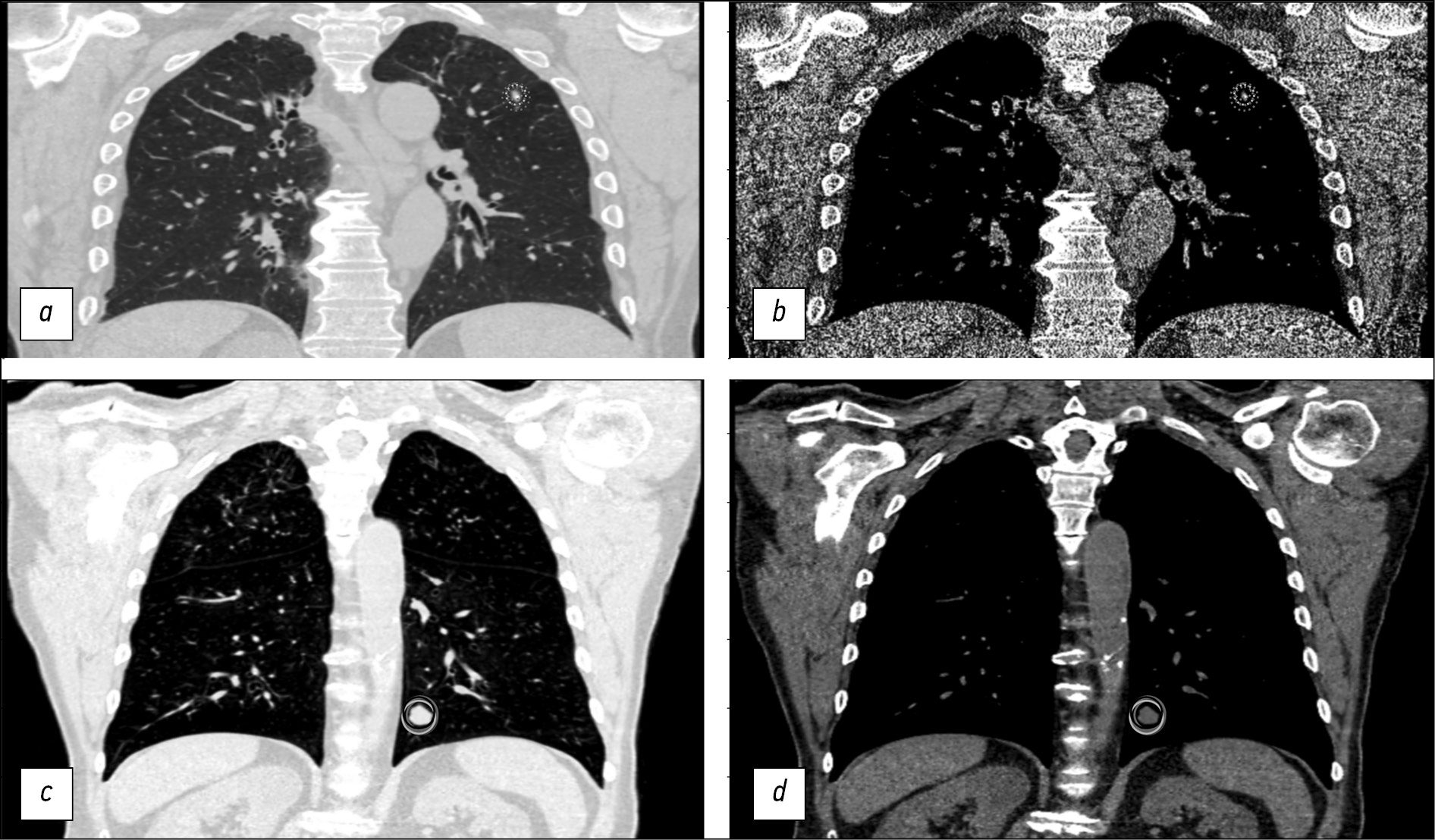 3. Fig. 2. Examples of CT studies with significant disagreement (a, b, CTLungCa-500 AN RLADD02000018919, ID RLSDD02000018855) and full agreement (c, d, CTLungCa-500 AN RLAD42D007-25151, ID RLSD42D007-25151) between experts. The studies are presented in frontal projection in pulmonary (a, c) and soft tissue (b, d) modes. The radiologists' marks are shown with different colors: a, b - the focus was marked by five primary experts out of six, four assigned it a solid type and one - a semi-solid one. The arbiter disagreed with their opinion, recognizing the find as benign calcification; c, d - All six primary assessors and the arbiter classified the lesion as potentially malignant solid.