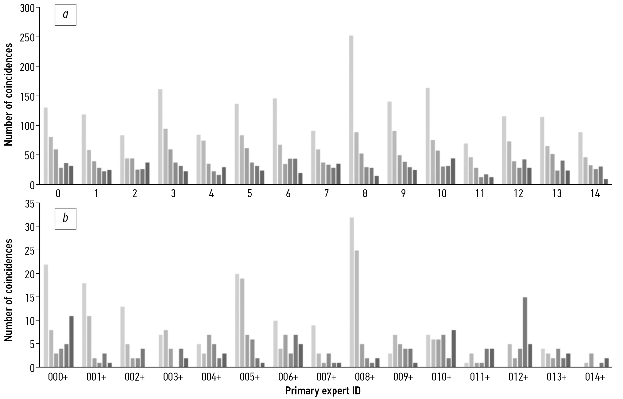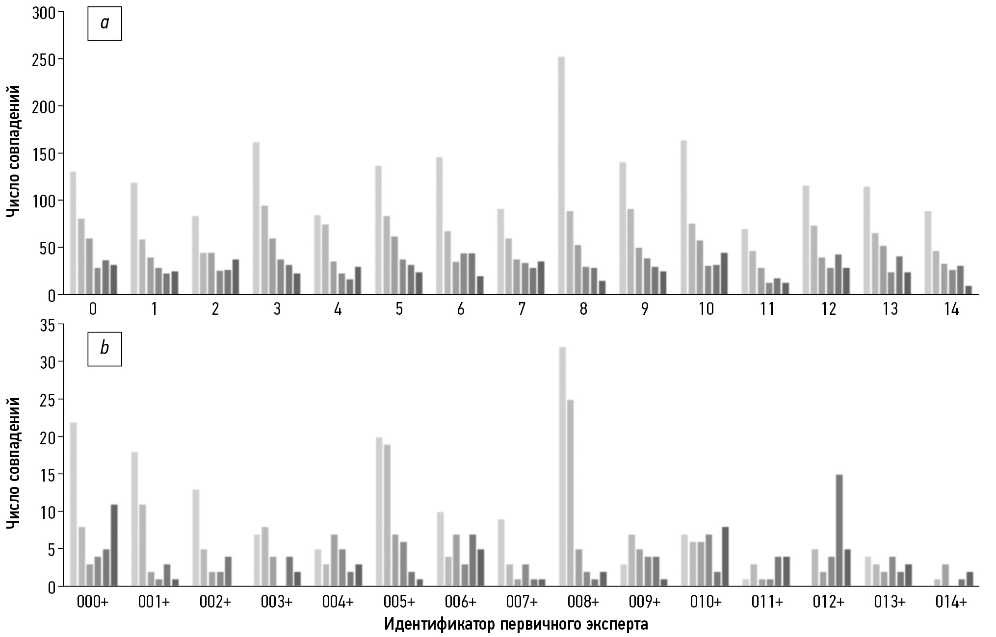 Fig. 3. Agreement between primary experts: a - for representatives of the original cohort of 15 radiographers; b - for replacement radiographers. The data for the expert with ID 000 ++ are not given due to the small number of lesions noted. For each radiologist, the first column corresponds to the number of lesions uniquely marked by that specialist (none of the other five experts recognized this finding). The following are columns corresponding to cases where the lesion identified by the radiologist was noted by one, two, three, four and five other primary experts. The scheduling did not take into account the approval of the arbiter, as well as the differences of opinion between radiologists about the type of lesion.
