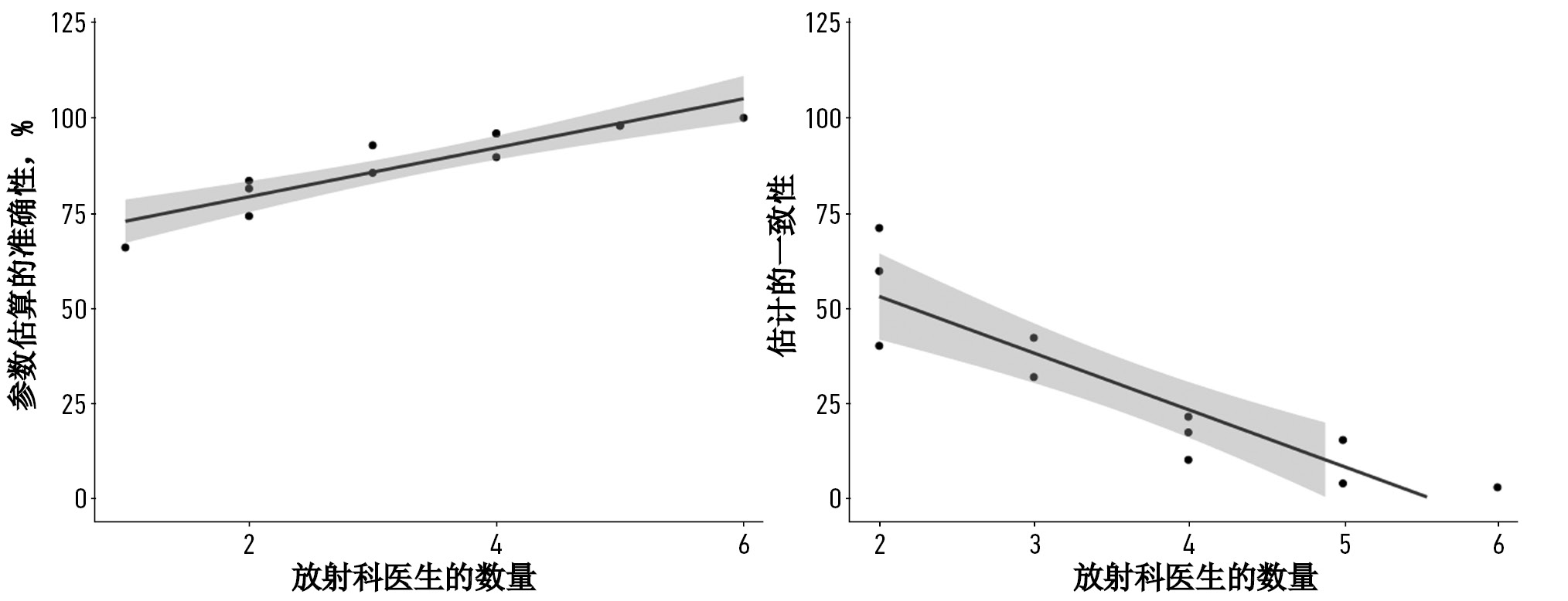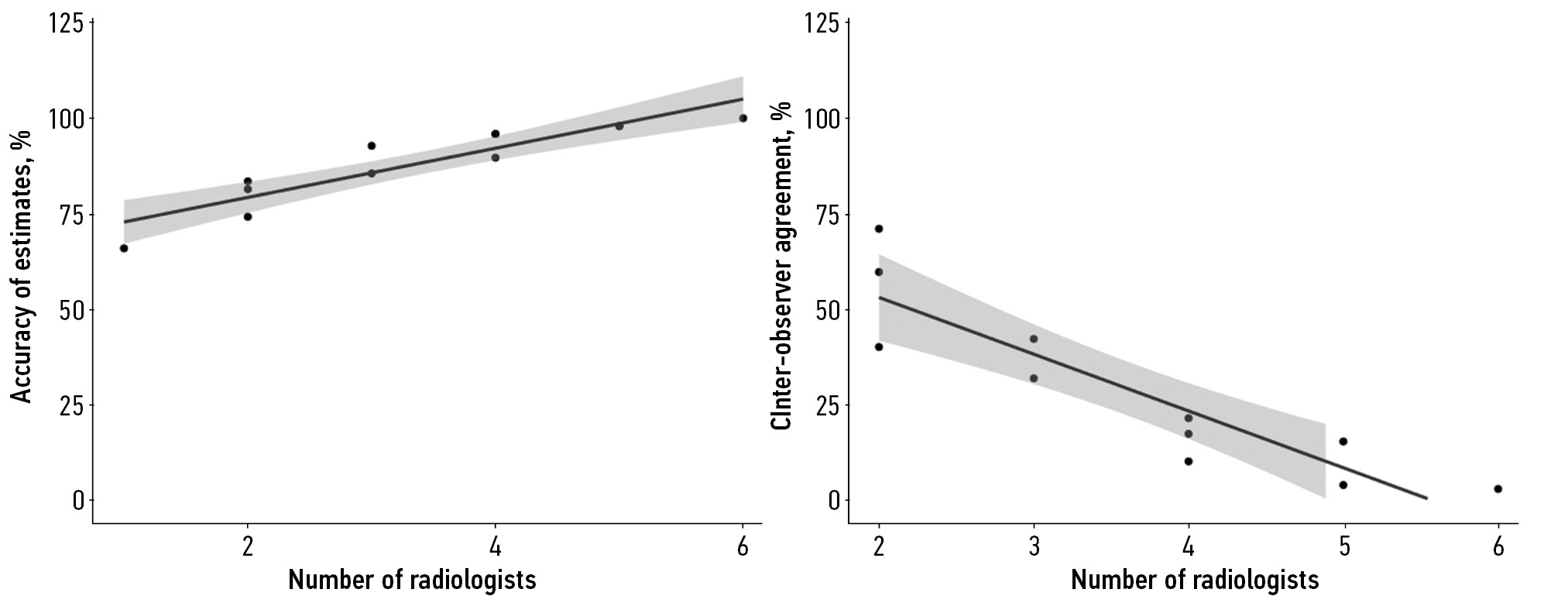 2. Fig. 1. Accuracy and consistency of estimates as a function of the number of radiographers participating in the primary survey. The 95% confidence interval is shown in gray. The points correspond to different samples of primary experts. For experiments with two, three and four experts, three different samples were selected from the original six radiographers; for five - two.