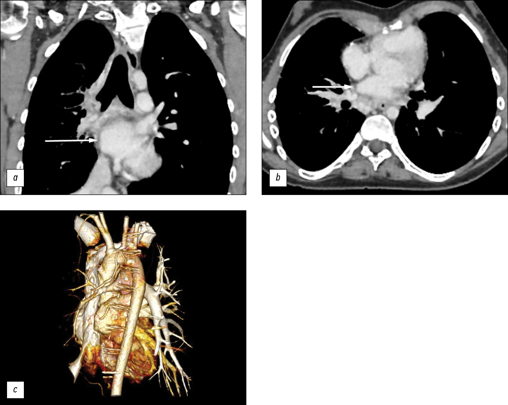 Fig. 4. Absence of the right pulmonary veins (white arrows); (a) computed tomography of the lung in the coronal plane; (b) computed tomography of the lung in the axial plane; (c) three-dimensional reconstruction of the heart.