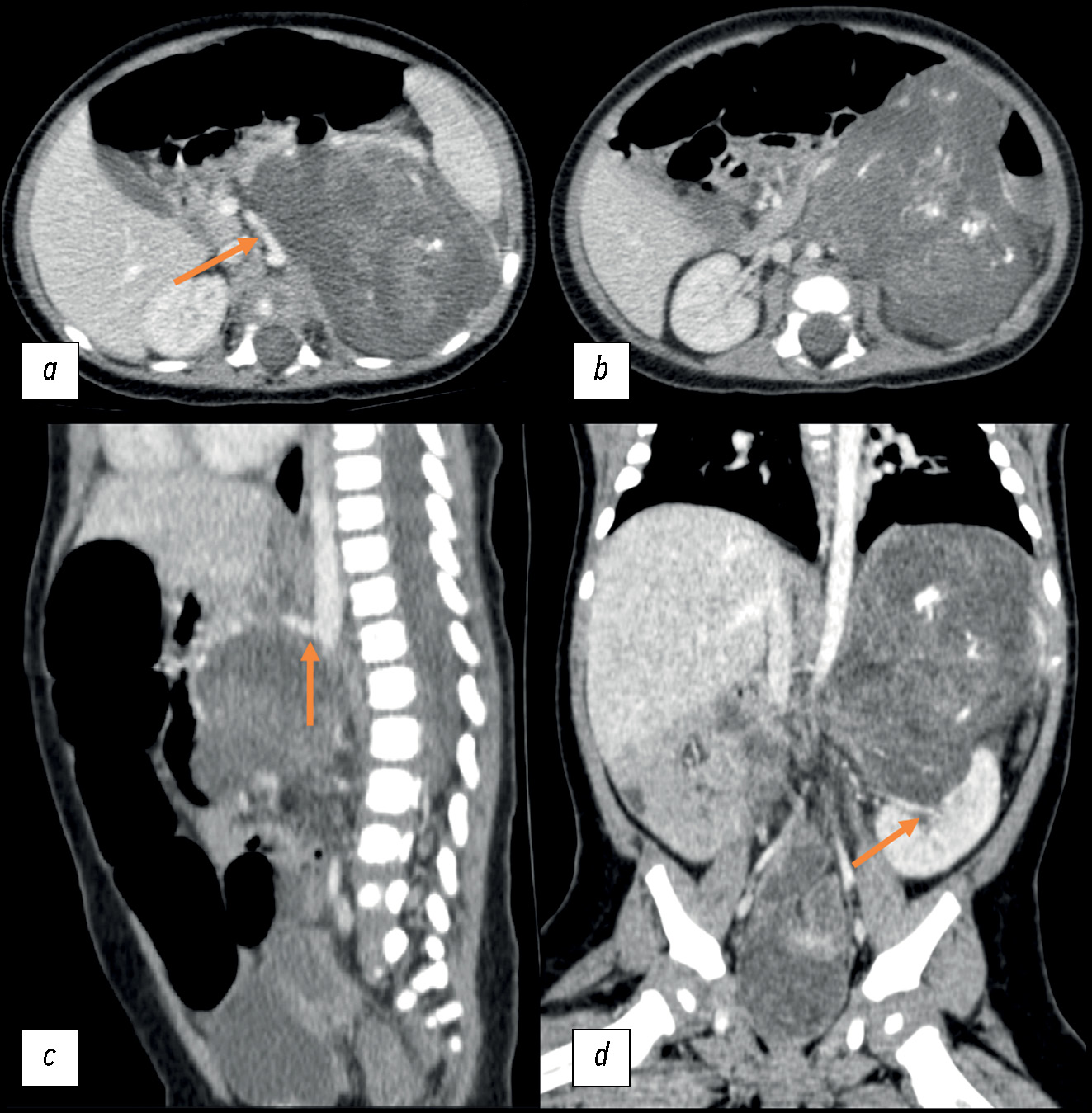 Fig. 1. Initial abdominal computed tomography using intravenous contrast dated September 23, 2020, a pattern of a space-occupying retroperitoneal mass on the left: (a) axial plane; the arrow indicates the displacement of the superior mesenteric artery to the right; (b) axial plane; (c) sagittal plane; the arrow indicates the upward displacement of the celiac artery; (d) coronal plane; the arrow indicates the tumor extension into the renal sinus.