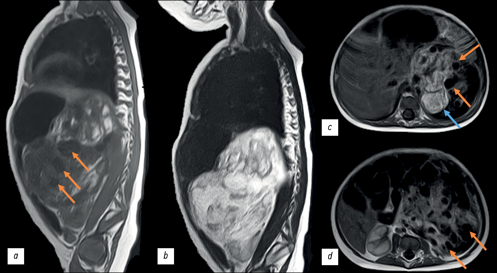 Fig. 2. Abdominal magnetic resonance imaging dated November 16, 2020: (a) Т1-weighted image, sagittal plane; (b) Т2-weighted image, sagittal plane; (c, d) Т1-weighted images, axial plane; a space-occupying mass of the left adrenal gland, with an increase in the size over time. Orange arrows indicate an attenuated signal from the cystic tumor component; the blue arrow indicates an enhanced signal from the solid tumor component.